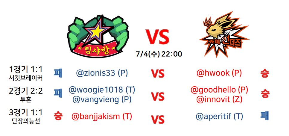1경기, 2경기 쥬피썬더즈 승, 3경기 팀샤방 승