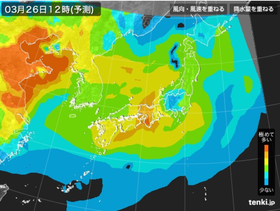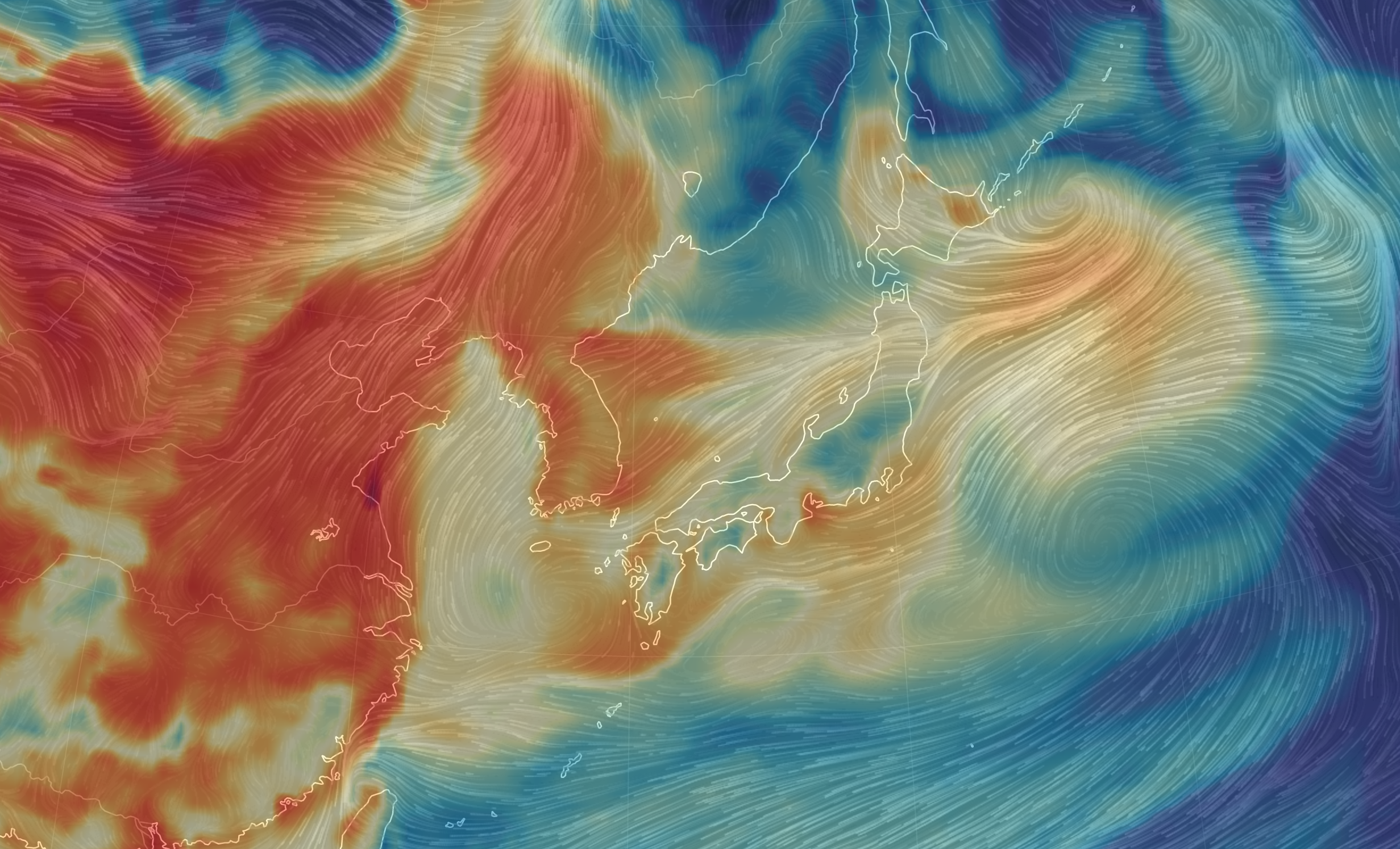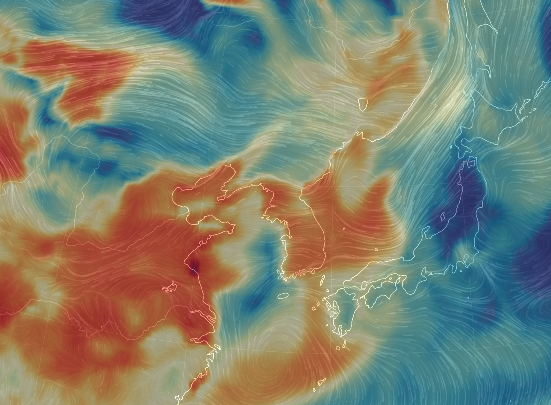 풍향이 직빵 서풍에서 약간 틀어진 남서풍으로 바뀌면서, 미세가 더 넘어 오지는 않지만 한반도에 있는 미세먼지가 잔류하는 그런 상황이 되겠습니다.