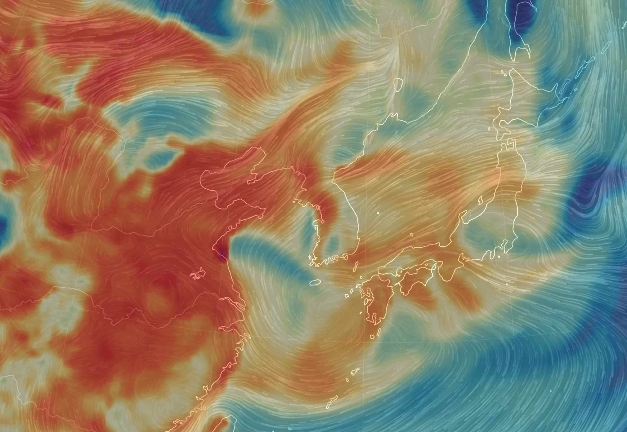 세계 최고의 미세먼지 생성국에서 서풍을 타고 넘실 넘실 붉은 물결이 넘어 오고 있습니다.