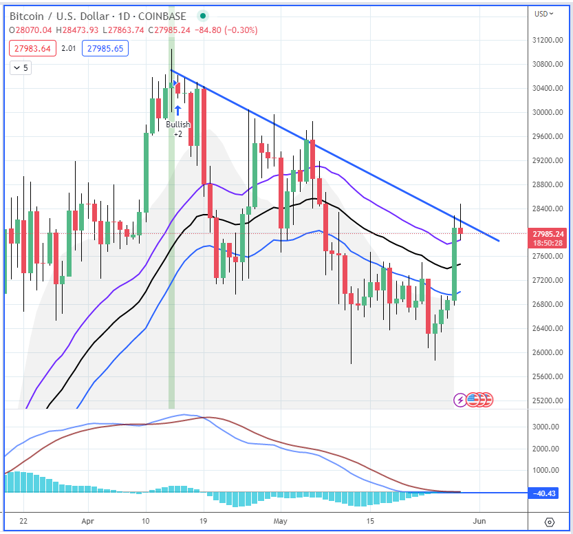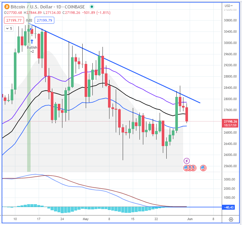 BTC / USD 5.30.2023steemCreated with Sketch.rtytf2 (85)in #kr • 3 years ago 이틀전에 포스팅 했듯이; Daily chart 에서의 저항성을 뚫고 올라가냐가 관건? 저항을 못뚫고 하락. 숨 좀 고르고 힘받아서 다시 한번 쭈욱 상승하기를~