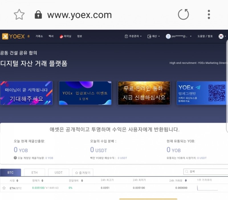 YOEX 거래소는 거래소 측의 설명에 따르면 중국계 거래소이며 IT 업계와 블록체인 업계의 전문가들과 코인 투자자들이 힘을 모아 제대로 사업을 해 보자는 마음으로 만든 좋은 거래소라고 합니다.