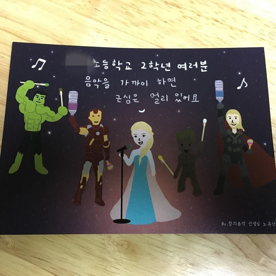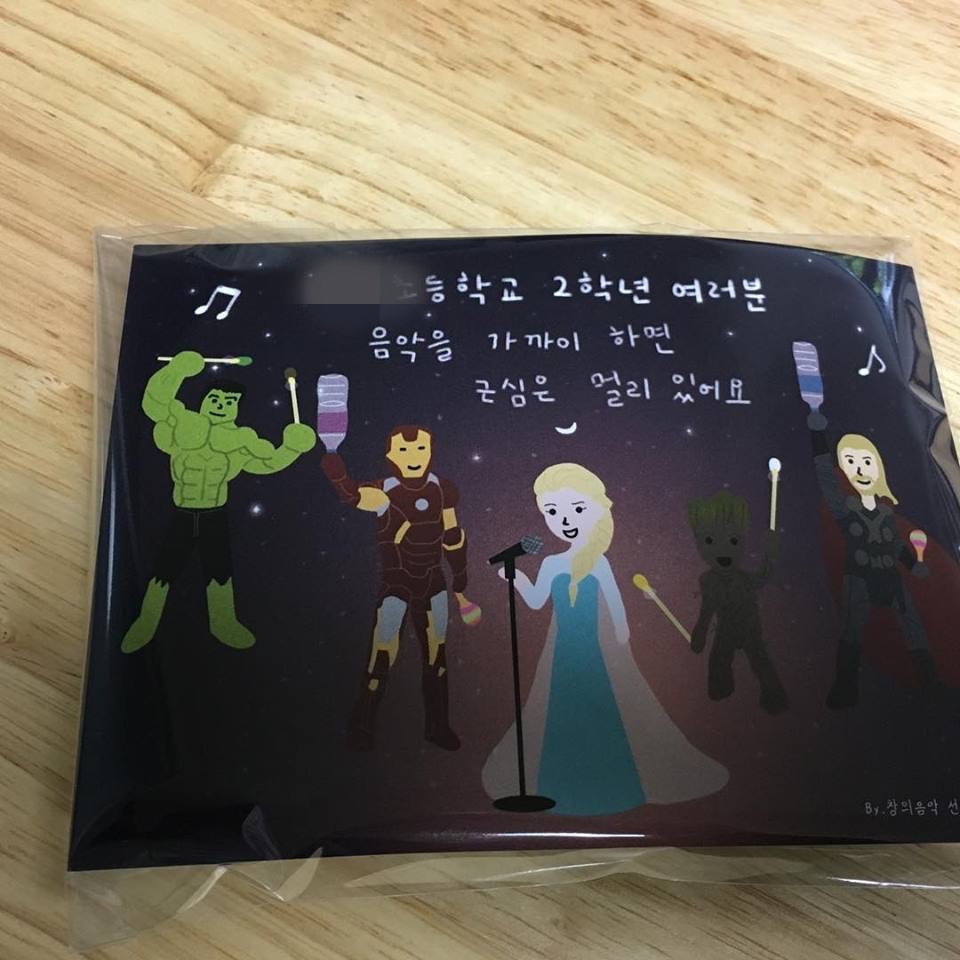 히어로들이 연주하는 모습을 엽서로 만들어 달라고 하트 송이님께 의뢰를 하였구요.