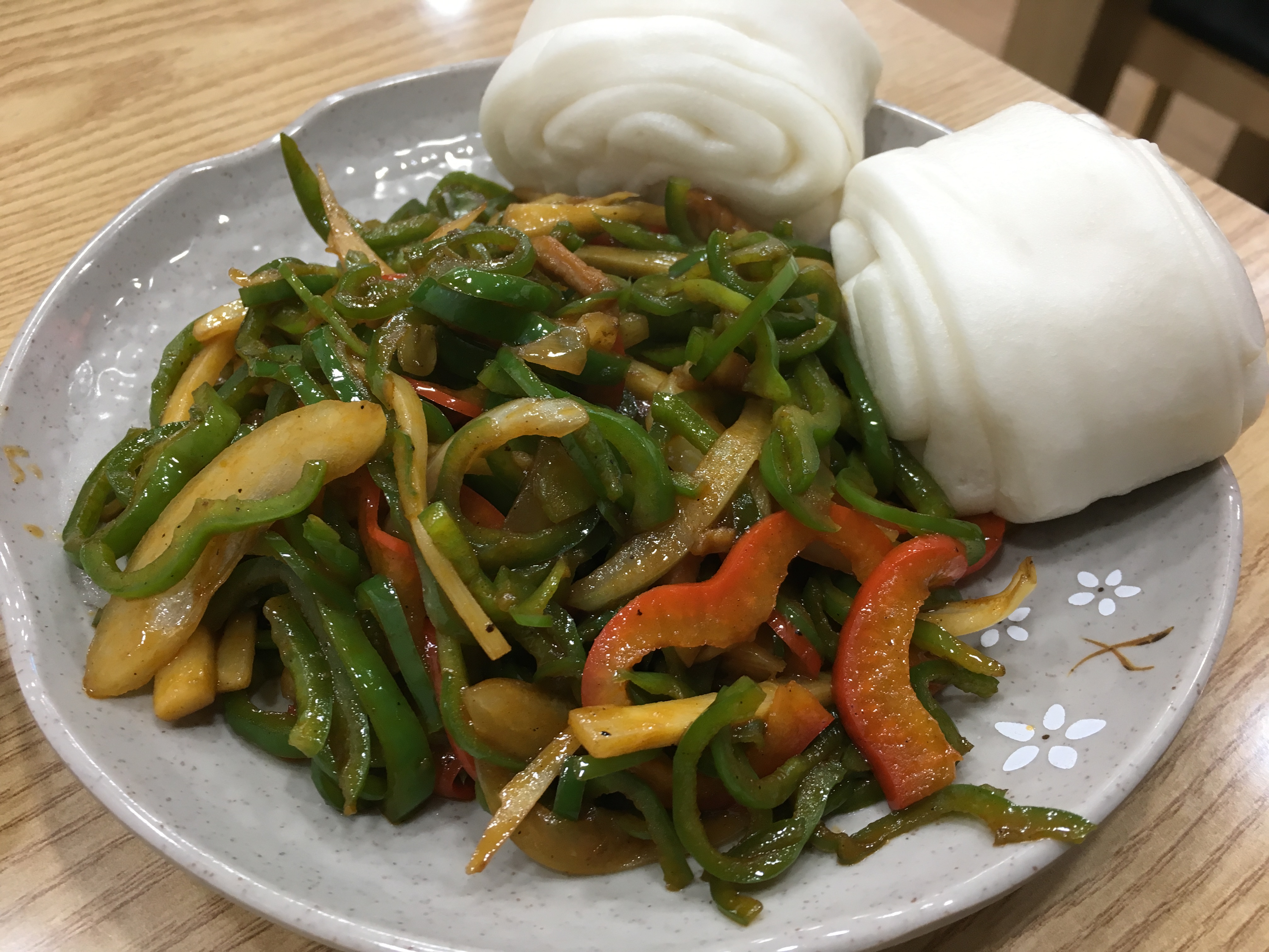 짭쪼롬하면서 아삭거리는 고추잡채를 김 모락 모락 나오는 꽃빵에 싸먹으면 크으. 꽃빵 추가 하고 싶은 맛이지요.