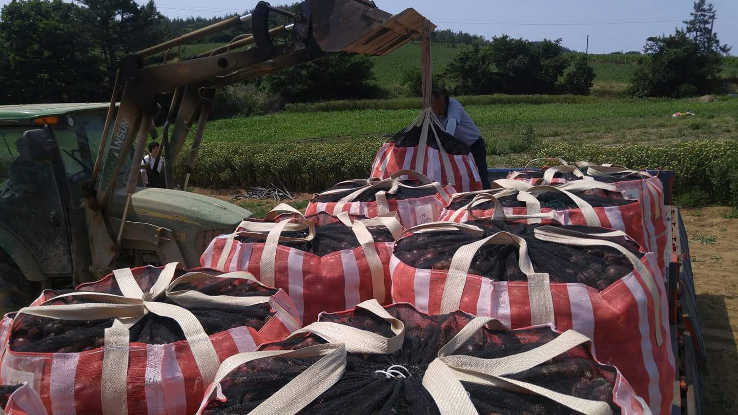 #사진 자색양파를 톤백에 담아 출하하는 모습