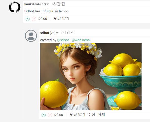 댓글에서 !sdbot 프롬프트 내용을 적어 줍니다.