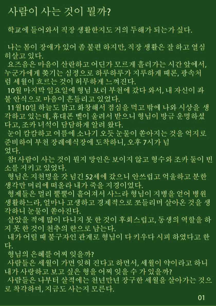 어딘가 모르게 형이 이 세상 어디에 살아 있다면 볼 수 있겠지만, 훗날을 기약할 수 없는 길을 가셨으니 내 마음이 아파오는 것을 참고서 오늘도 열심히 살면서 살아있는 목숨을 어찌 할 수가 없어서 찬밥을 데워서 저녁 끼니를 때우면서 눈물을 흘린다.