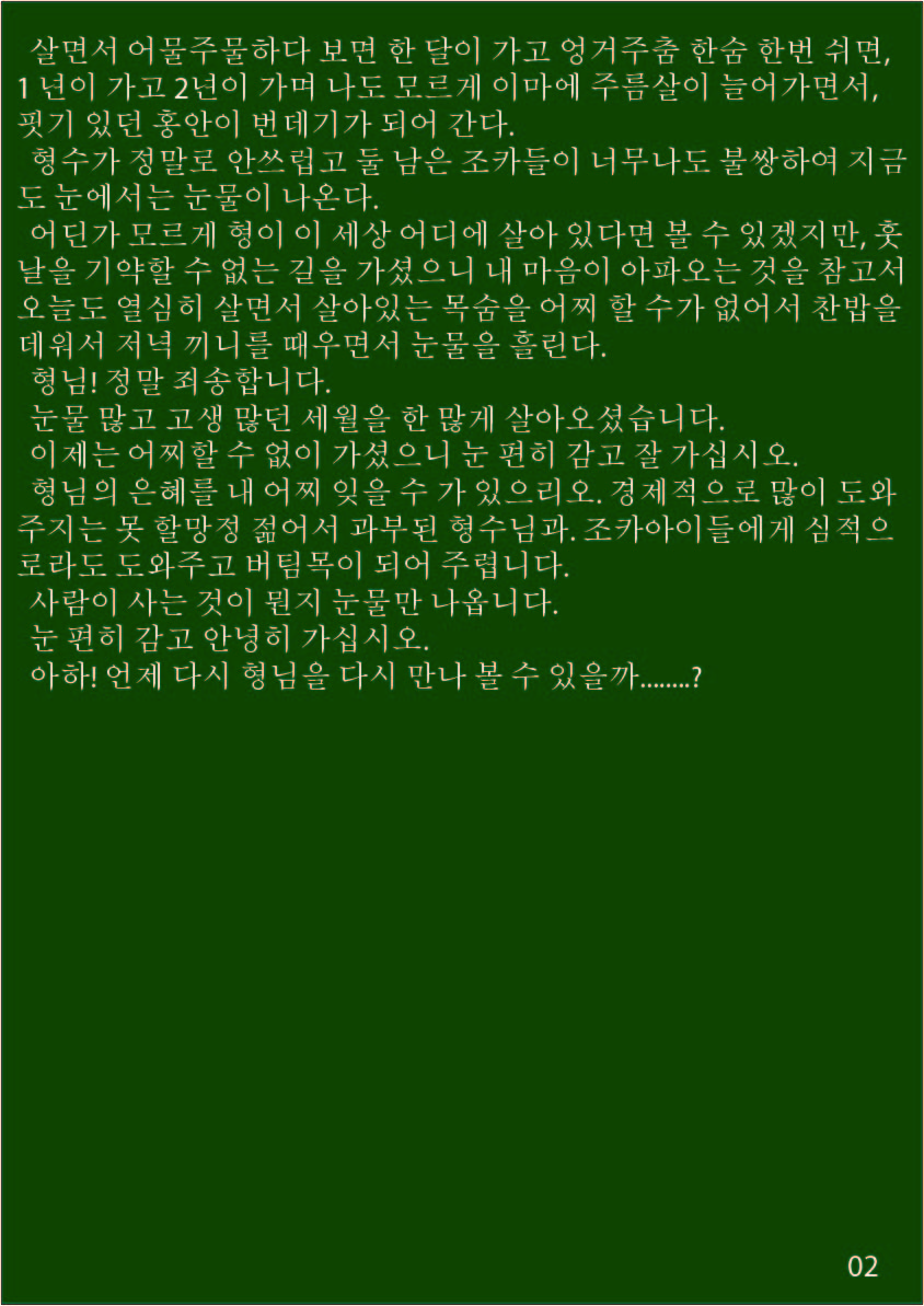 형수가 정말로 안쓰럽고 둘 남은 조카들이 너무나도 불쌍하여 지금도 눈에서는 눈물이 나온다.