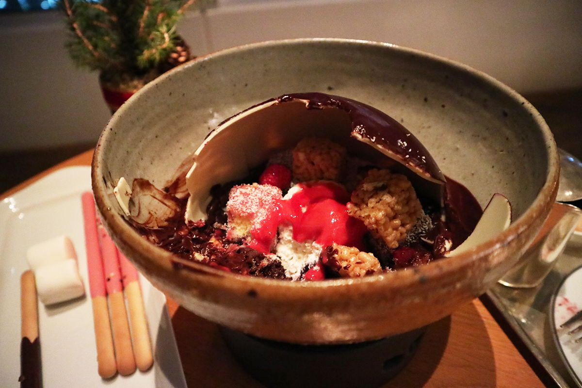 차를 한모금 음미하고 있을때, 주문했던 초코렛 퐁듀 디저트 세트도 나왔습니다. 드라이 아이스위에 올려진 초코렛볼에 다크 초코렛을 부어주는 데, 그 모습이 너무나도 고급져 탄성이 절로 나왔어요.