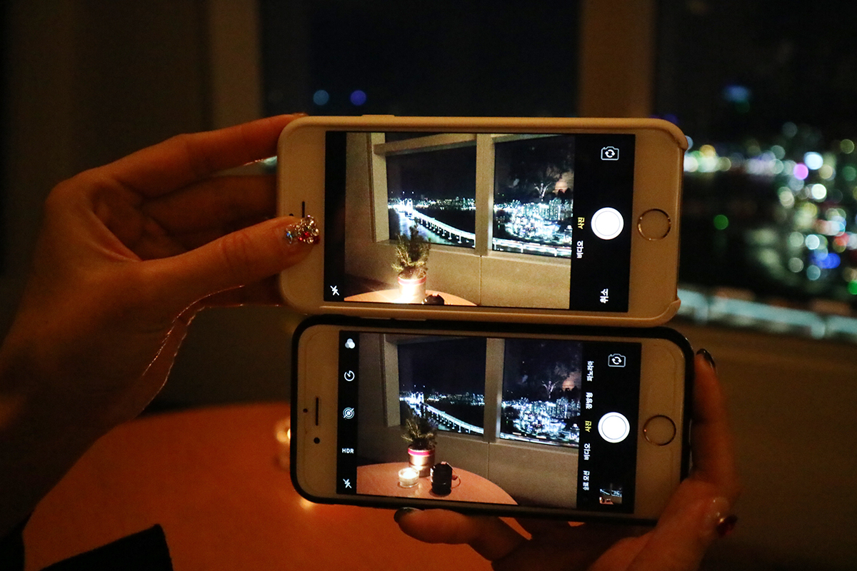 서로 휴대폰으로도 멋진 야경을 찍으면서 같은 아이폰인데, 화질이 조금 차이 나기에 기종을 확인해보니 저는 6, 후배는 6s더라구요. 이부분에서 잠시 서로 웃기도 하였답니다. 비교하는 모습을 카메라에도 담아보았어요. 잠시, 휴대폰을 새로 사야하나 고민도 했었답니다.