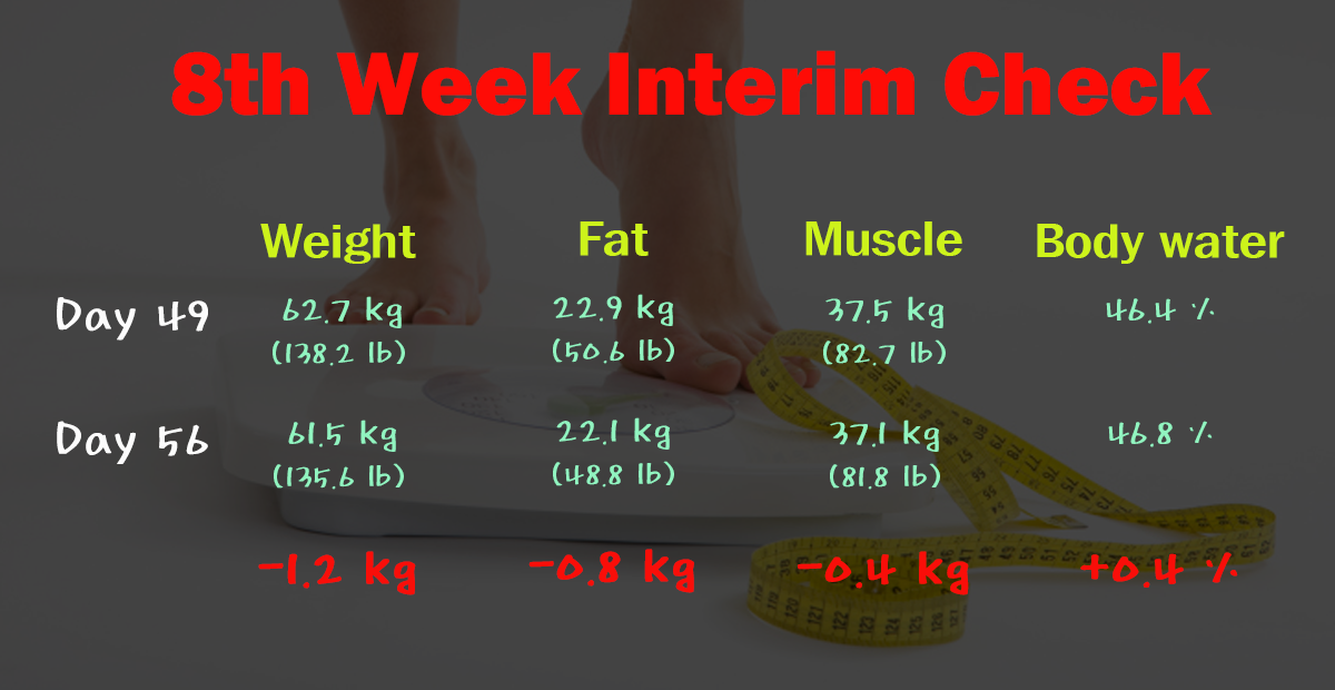 7주차에 비해 1.2kg 이 빠졌고 그 중에 지방이 0.8kg, 근육이 0.4kg 빠졌습니다.