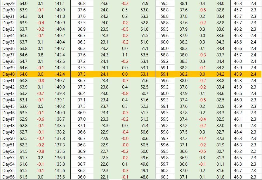 주황색으로 표시된 40일 차는 몸무게를 재지 못하여 39일차와 동일하게 채워넣은 것입니다.