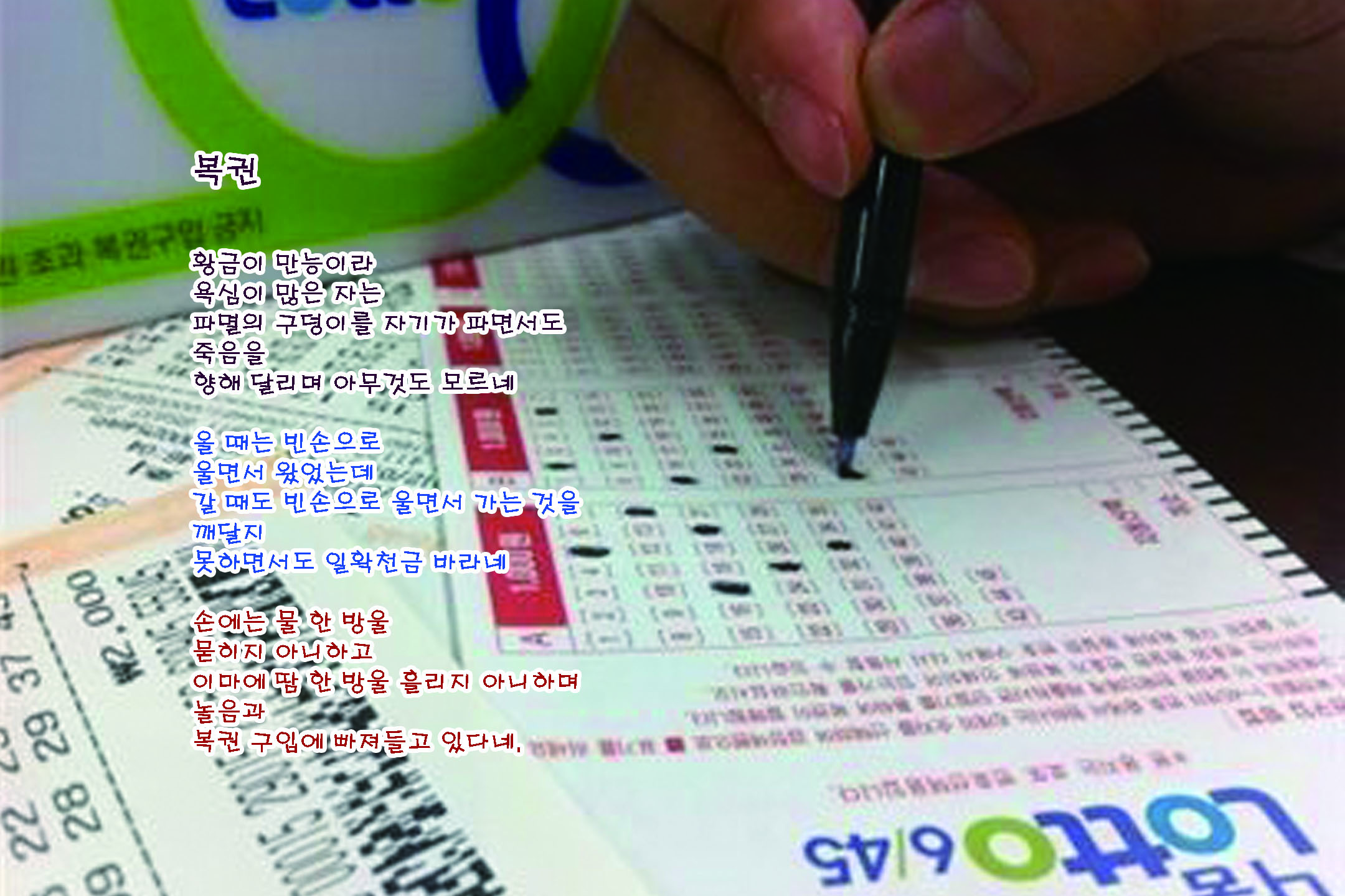 Poem - 복권sh1 (54)in #kr • 8 years ago (edited) 복권 황금이 만능이라 욕심이 많은 자는 파멸의 구덩이를 자기가 파면서도 죽음을 향해 달리며 아무것도 모르네 올 때는 빈손으로 울면서 왔었는데 갈 때도 빈손으로 울면서 가는 것을 깨달지 못하면서도 일확천금 바라네 손에는 물 한 방울 묻히지 아니하고 이마에 땀 한 방울 흘리지 아니하며 놀음과 복권 구입에 빠져들고 있다네. #steem #interesteem #jyinvest #jjangjjangman