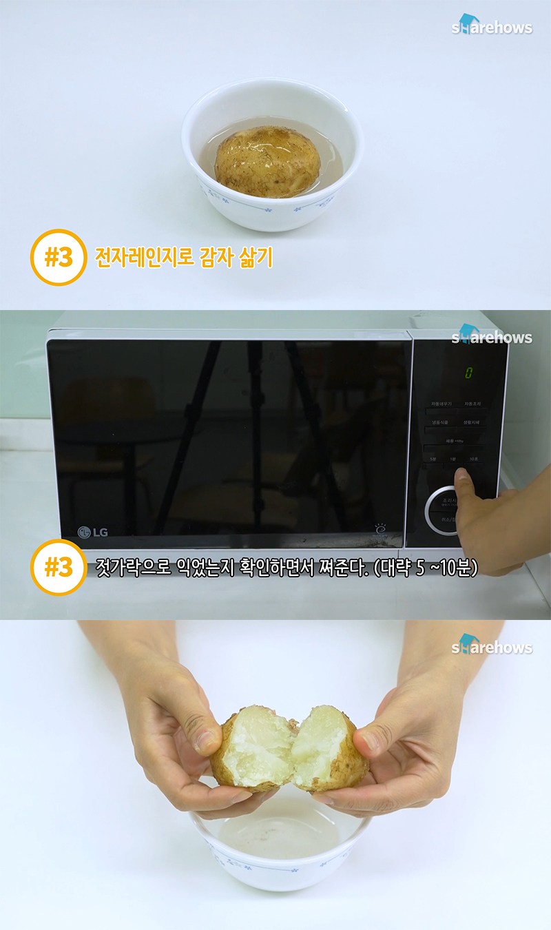 – 전자레인지에 사용이 가능한 그릇에 감자를 넣고 물을 감자가 잠길 만큼 넣어주세요. 전자레인지에 돌릴 때 중간중간 젓가락으로 찔러보면서 익었는지 확인하면서 삶아주세요. (대략 5~10분)