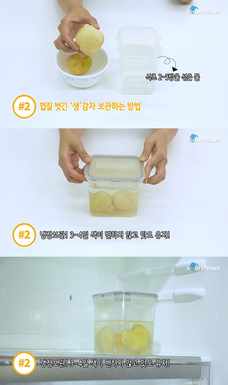 – 식초를 몇 방울 섞은 식초물에 감자를 담가서 보관하면 3~4일 색과 맛 변화 없이 유지가 가능하답니다.
