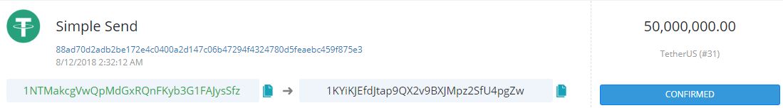 거래 발생 주소와 USDT 발행 주소가 일치하지 않는다. 해당 거래가 시작된 주소는 '1NTMakcgVwQpMdGxRQnFKyb3G1FAJysSfz'로 발행시 쓰이는 테더 측의 공식 주소가 아니다