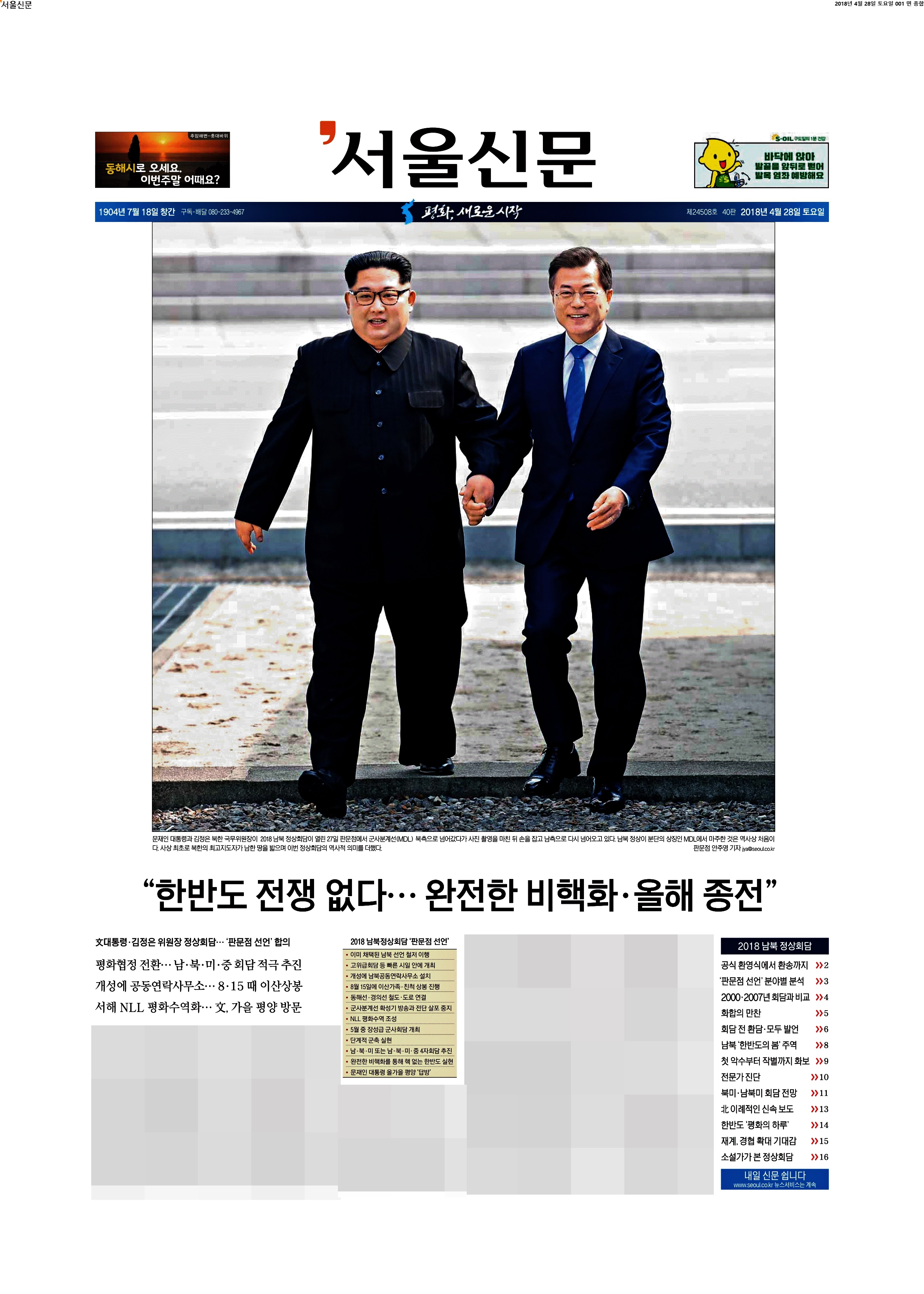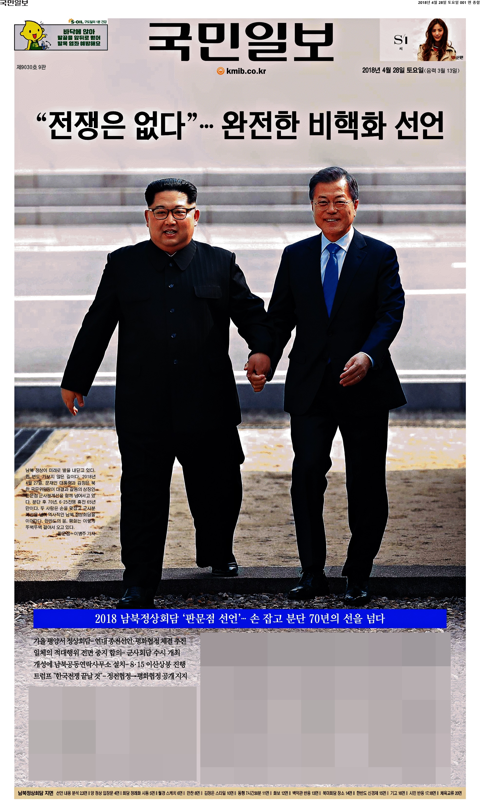 제목에 종전 관련 이야기가 들어있다. 나쁘지 않은 선택. 개인적으로 밑에 파란 배경 안에 있는 제목이 더 마음에 든다. 손 잡고 분단 70년의 선을 넘다. 국민 대부분이 전날 TV로 모든 걸 지켜보고 선언 내용도 대략 다 알고 있는데 굳이 팩트를 위로 올릴 필요는 없다는 게 내 생각. 단지 내 생각.