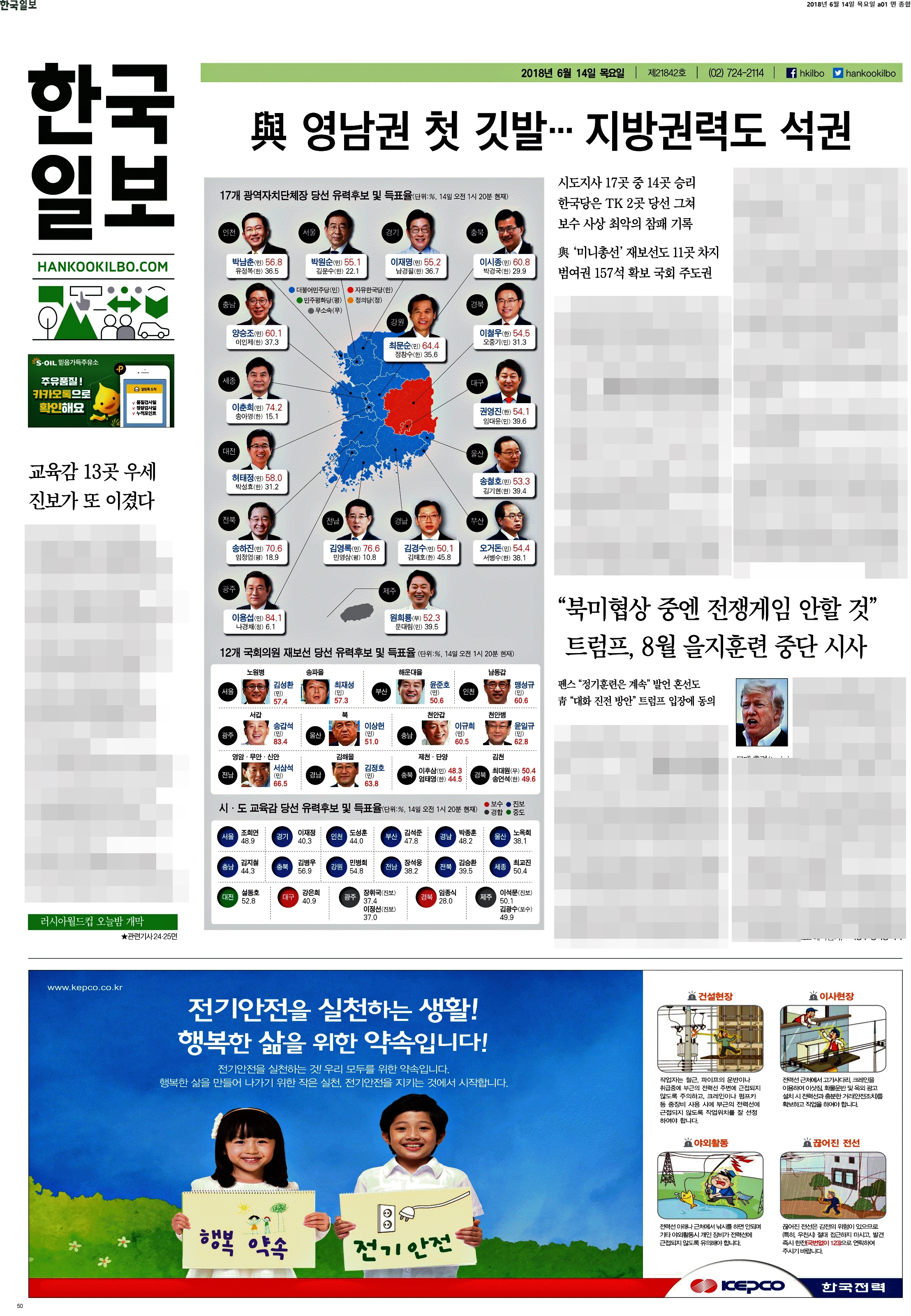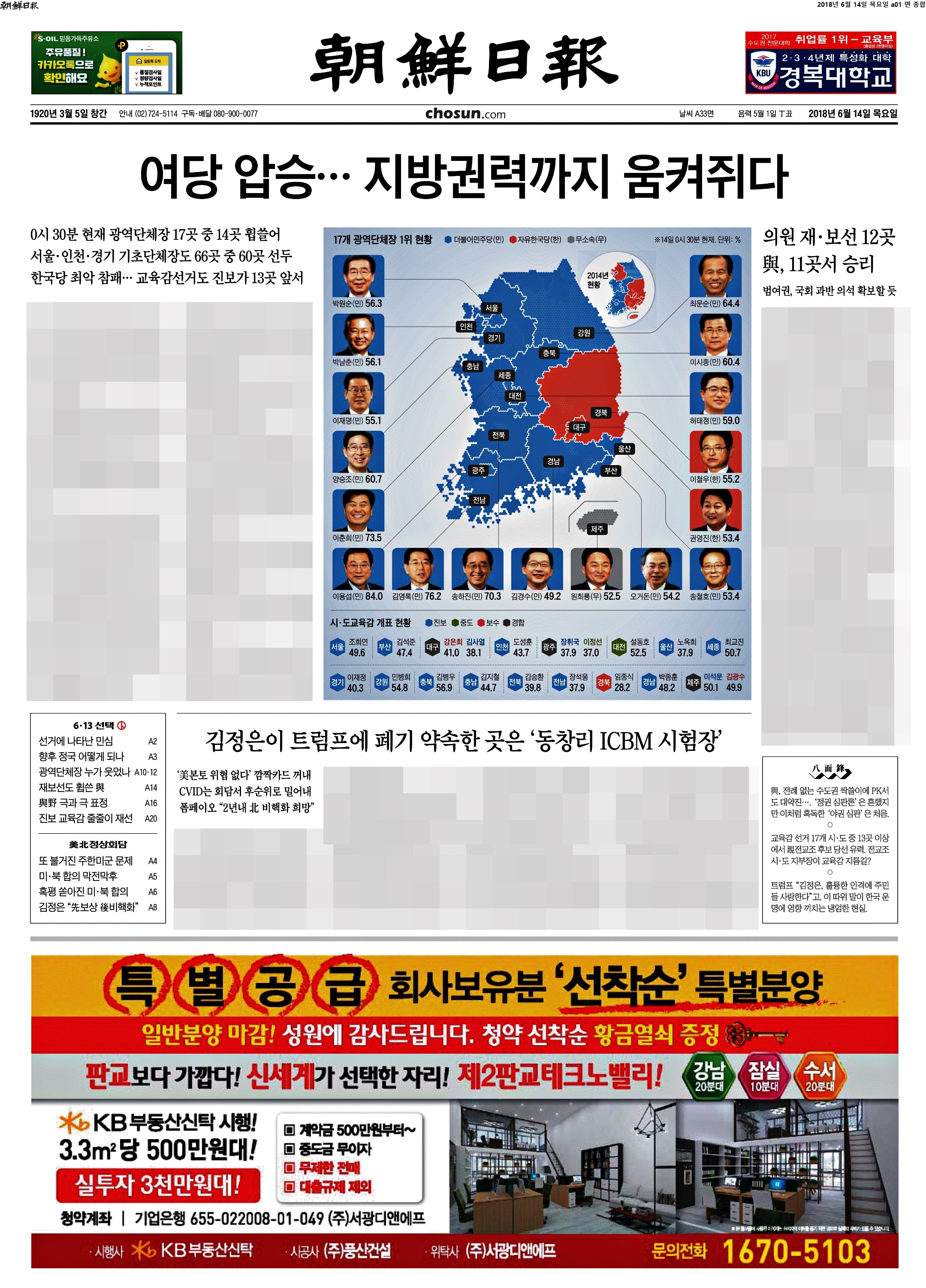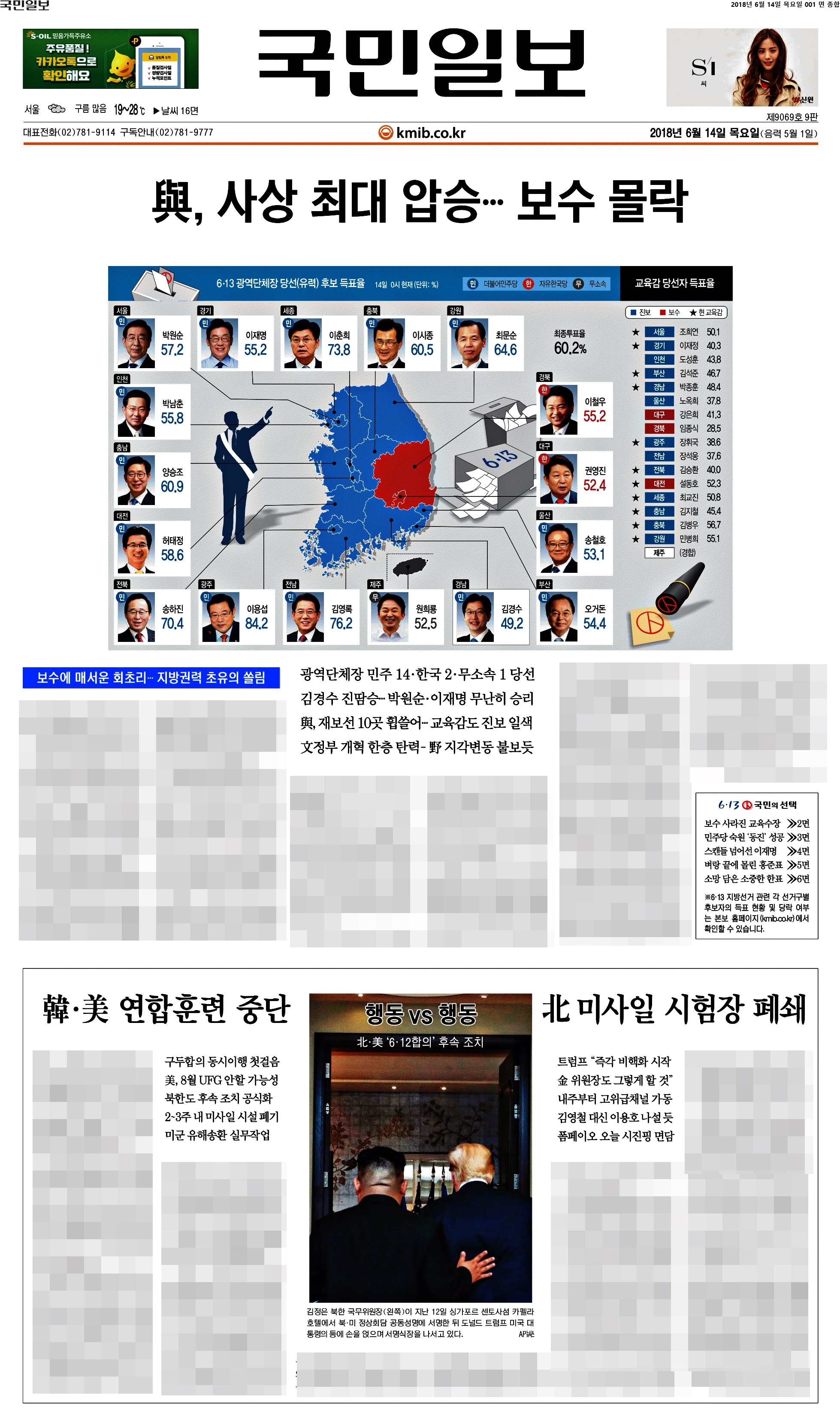 제일 재밌는 1면 등장이다. 역시 이 공장은 절대 실망시키지 않는다. "지방권력까지 움켜쥐다"라고 썼다. 중앙권력을 장악한 여당이 지방까지 움켜줬으니 이제 큰일났다(?)는 것 같다. 팔면봉도 압권이다. 안 보이시는 분들을 위해 '여, 전례없는 수도권 싹쓸이에 PK서도 대약진... 정권 심판론은 흔했지만 이처럼 혹독한 야권심판은 처음' '교육감 선거 17개 시도 중 13곳 이상에서 친전교조 후보 당선 유력. 전교조 시도지부장이 교육감 지름길?' '트럼프 "김정은, 훌륭한 인격에 주민들 사랑한다"고. 이따위 말이 한국 운명에 영향 끼치는 냉엄한 현실'