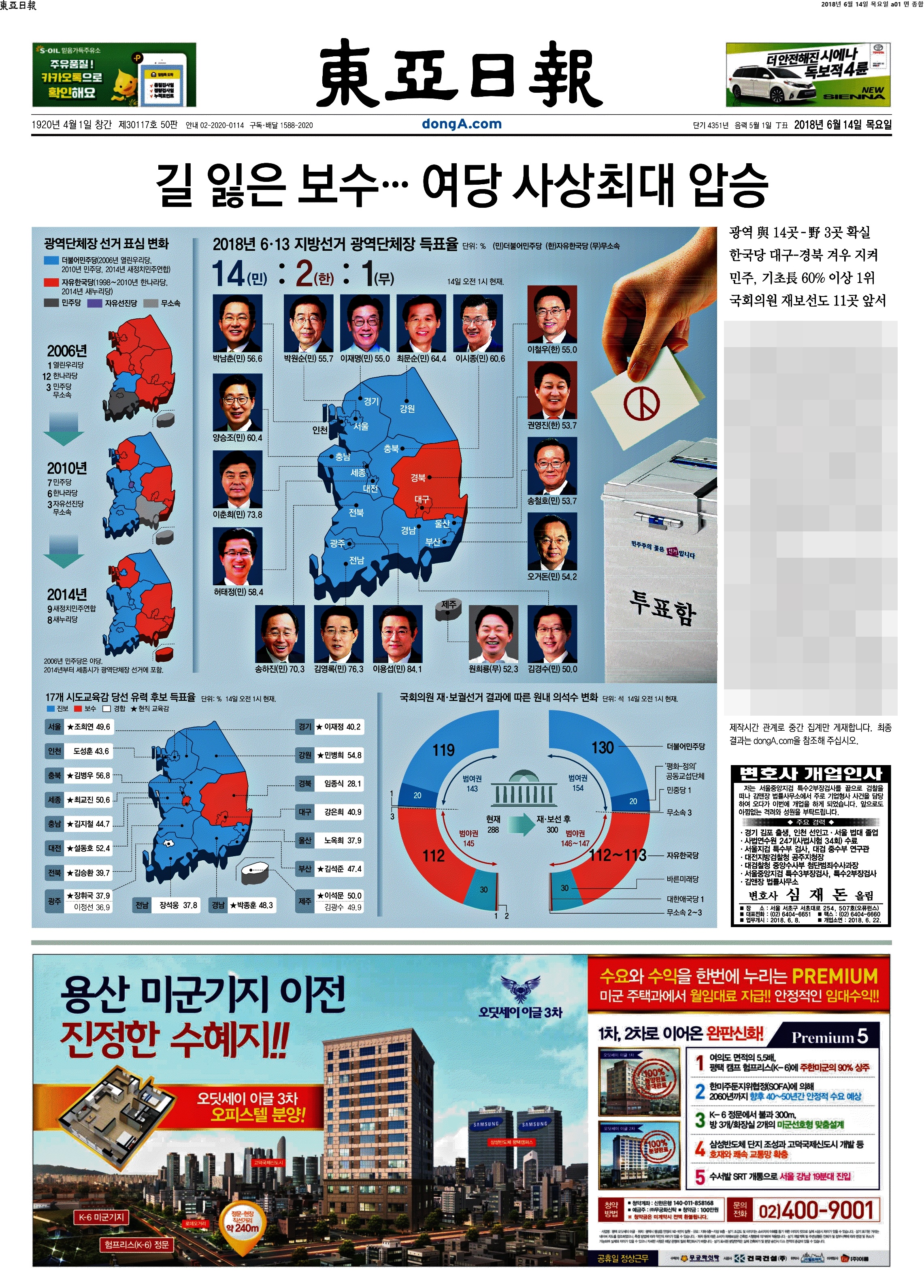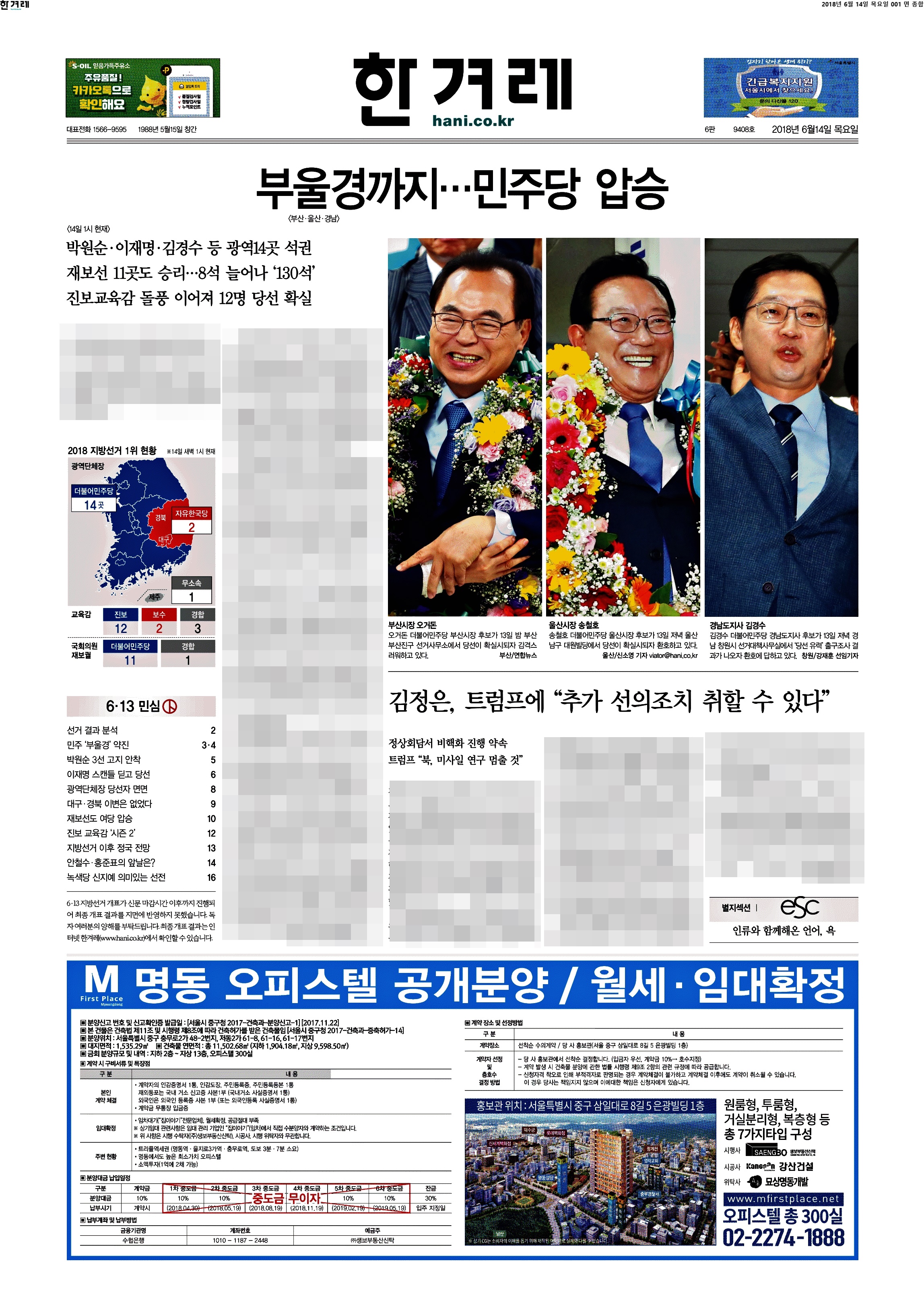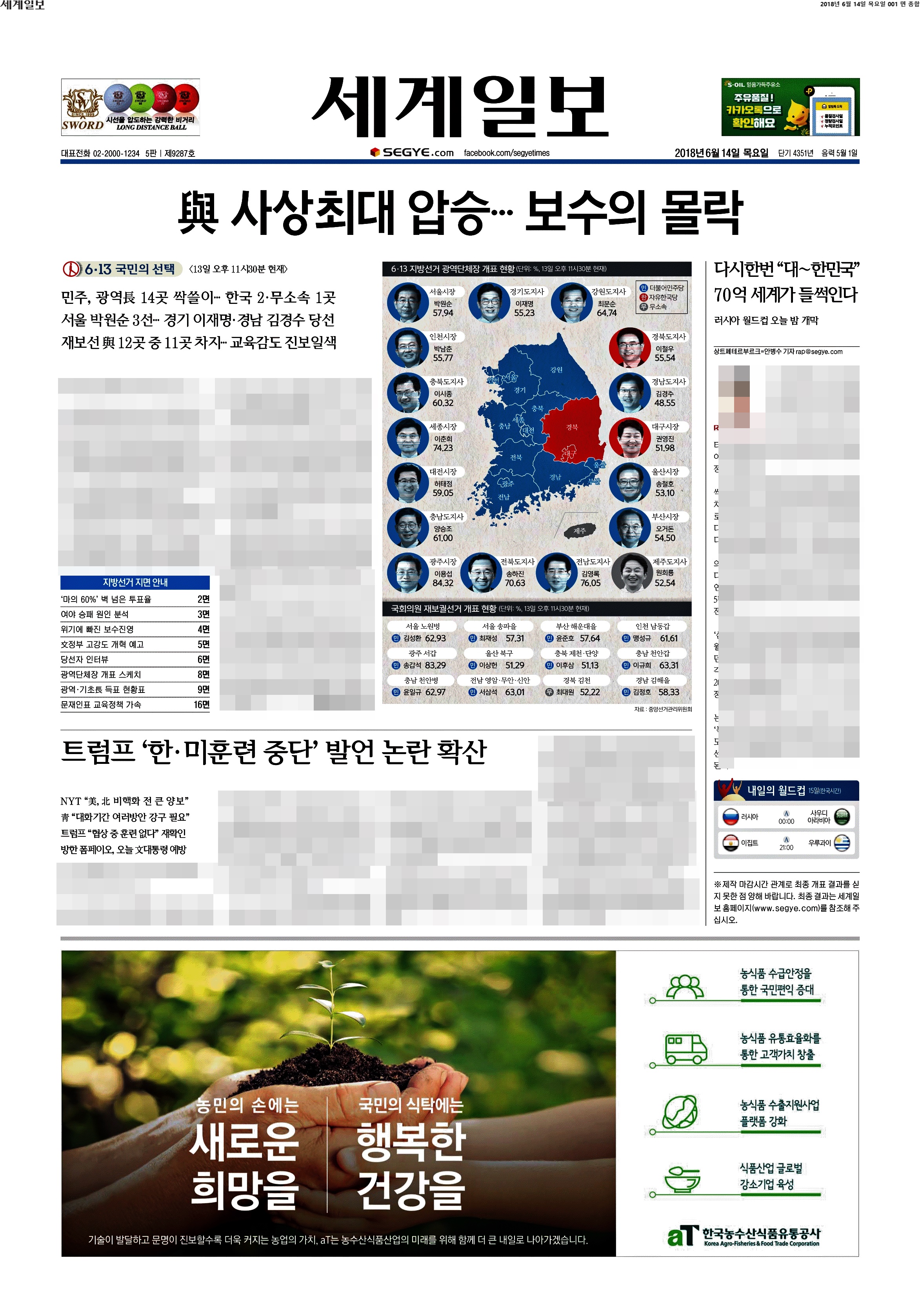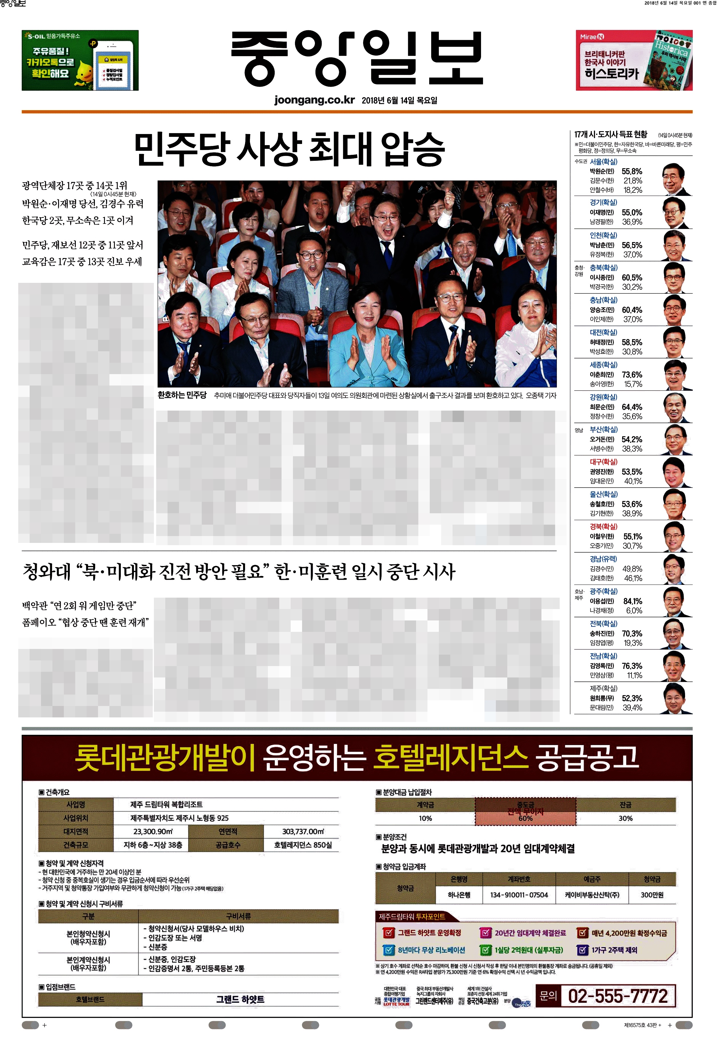 제일 재밌는 1면 등장이다. 역시 이 공장은 절대 실망시키지 않는다. "지방권력까지 움켜쥐다"라고 썼다. 중앙권력을 장악한 여당이 지방까지 움켜줬으니 이제 큰일났다(?)는 것 같다. 팔면봉도 압권이다. 안 보이시는 분들을 위해 '여, 전례없는 수도권 싹쓸이에 PK서도 대약진... 정권 심판론은 흔했지만 이처럼 혹독한 야권심판은 처음' '교육감 선거 17개 시도 중 13곳 이상에서 친전교조 후보 당선 유력. 전교조 시도지부장이 교육감 지름길?' '트럼프 "김정은, 훌륭한 인격에 주민들 사랑한다"고. 이따위 말이 한국 운명에 영향 끼치는 냉엄한 현실'