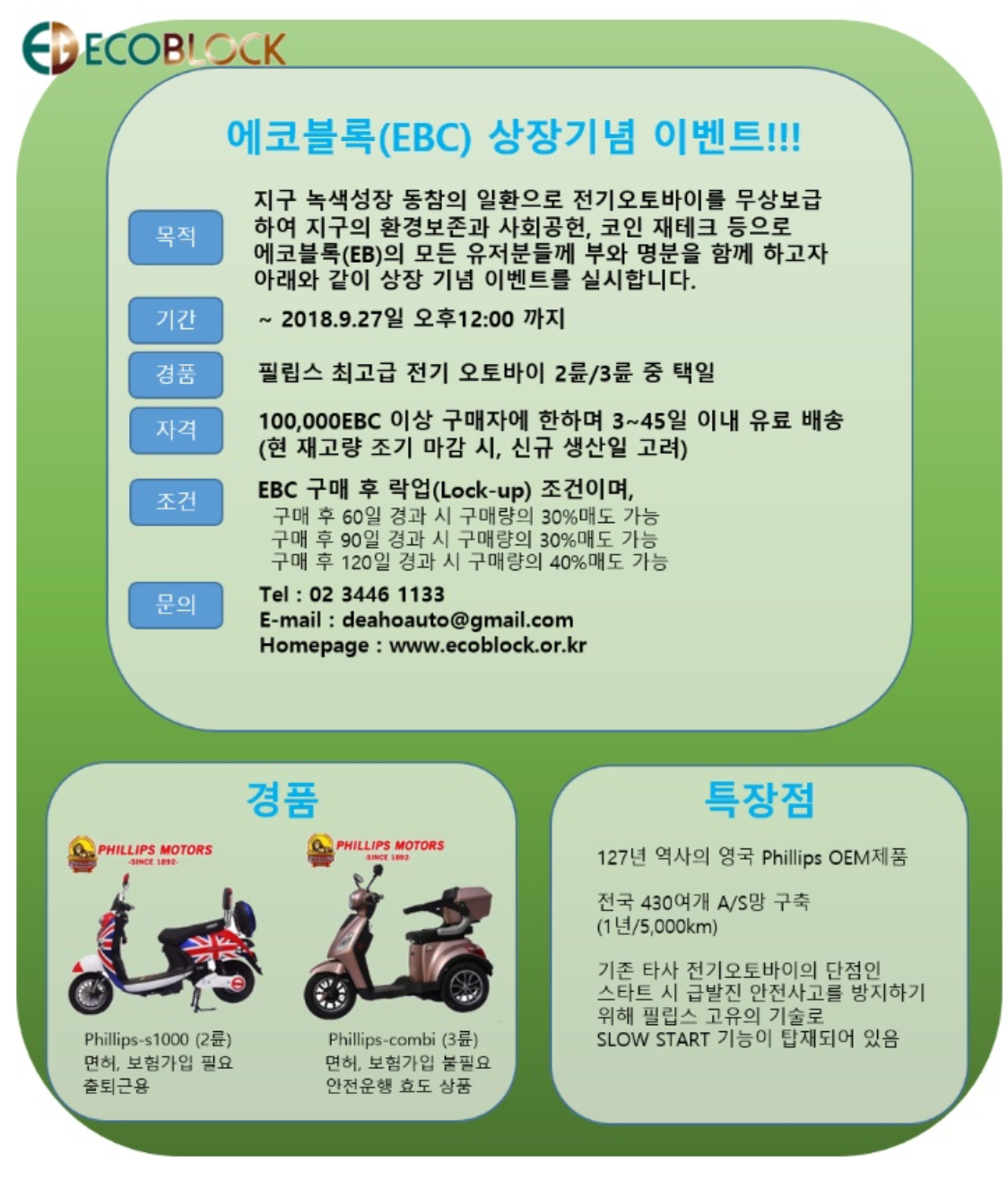 한편, 코인25EX에서는 에코블록 상장기념으로 10만 에코블록을 구입하는 고객에게는 무공해 전기스쿠터를 사은품으로 제공하는 이벤트도 진행한다.