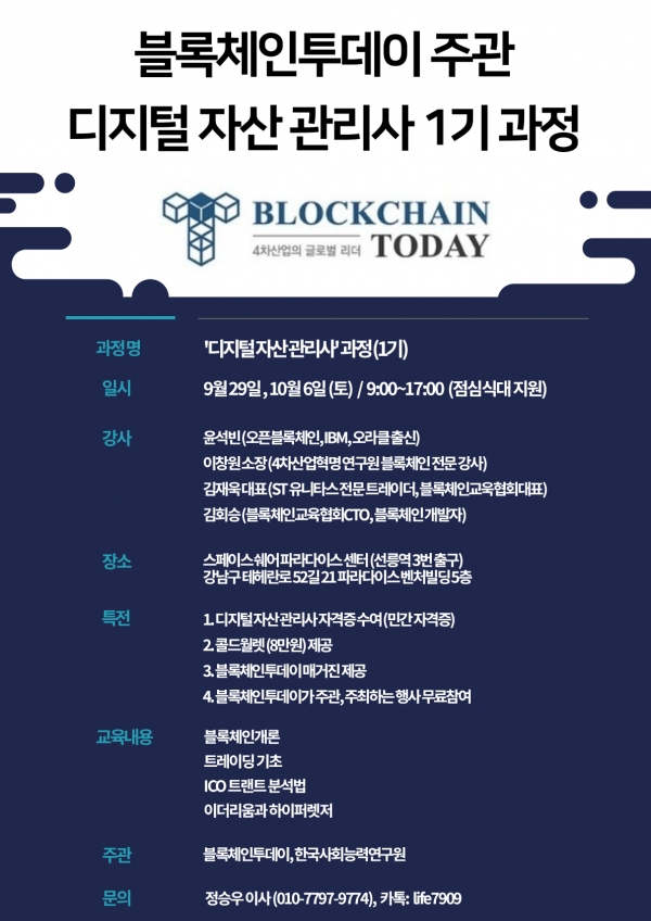오는 9월 29일(토)과 10월 6일(토), 블록체인투데이(BlockchainToday)와 한국사회능력연구원이 주관하는 ‘디지털자산관리사’ 과정 1기가 진행된다.