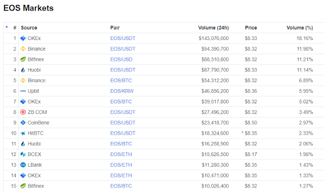 이오스의 24시간 거래량을 봐도 우리나라의 대표 거래소 중 하나인 Upbit가 5.88%의 비중으로 6위에 위치해있네요.올해 초에 한창 주목받을 때는 빗썸과 Upbit가 1, 2위를 다퉜었는데, 지금은 국내의 암호화폐 투자가 많이 시들어졌나 봅니다.