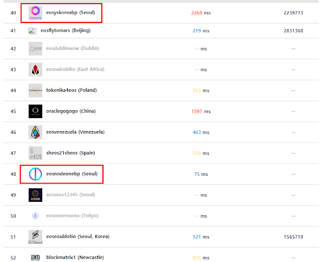 이오스 BP 순위가 21위 안에 들어야만 블록 생성과 검증 과정에 참여할 수 있습니다. 투표 초기만 해도 우리나라의 많은 이오스 홀더들의 투표로 EOSYS와 EOSEOUL이 BP 후보안에 들었는데요. 아쉽게도 오늘 18/07/20 기준으로 EOSYS는 40위, EOSEOUL은 51위네요. (EOSNODEONE은 48위입니다.)