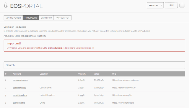 현재 EOS BP순위들입니다. 1위는 EOSCANADACOM 이라는 팀이네요. 실질적인 블록생성에 참여해서 최근 6860323번 블록을 생성했다고 나와 있습니다. 21위에 드는 팀의 국가는 중국이 4팀으로 가장 많은데요, 기사에서 나오던 중국의 블록체인 열풍이 사실인가 봅니다. 이외에도 20위에 랭크된 eosbixinboot이라는 태국팀 또한 인상적입니다.