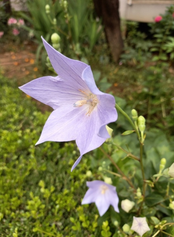 아파트 화단에 도라지꽃이 예쁘게 피었다.