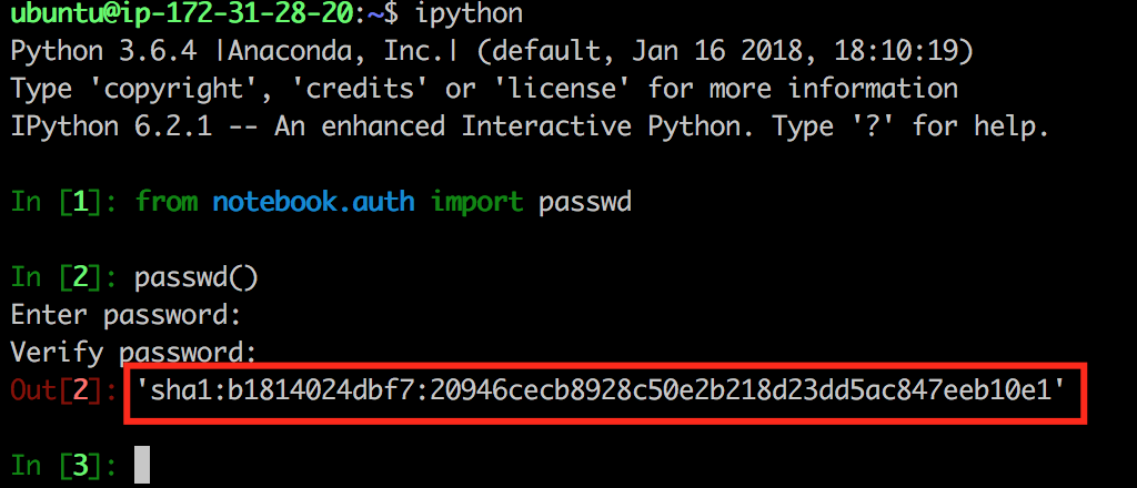 echo c.NotebookApp.password = u’sha1:암호헤시코드’ >> /home/ubuntu/.jupyter/jupyter_notebook_config.py
