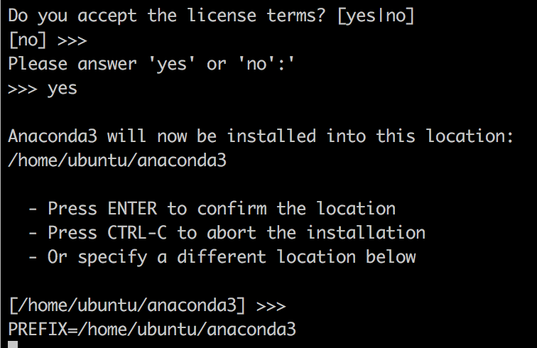 마지막, basrc 에 Anaconda 경로를 추가 할것인지에 대해서 묻습니다. yes로 해주어야 ubuntu에 기본적으로 설치된 python대신 Anaconda 패키지로 설치한 Python이 실행됩니다.