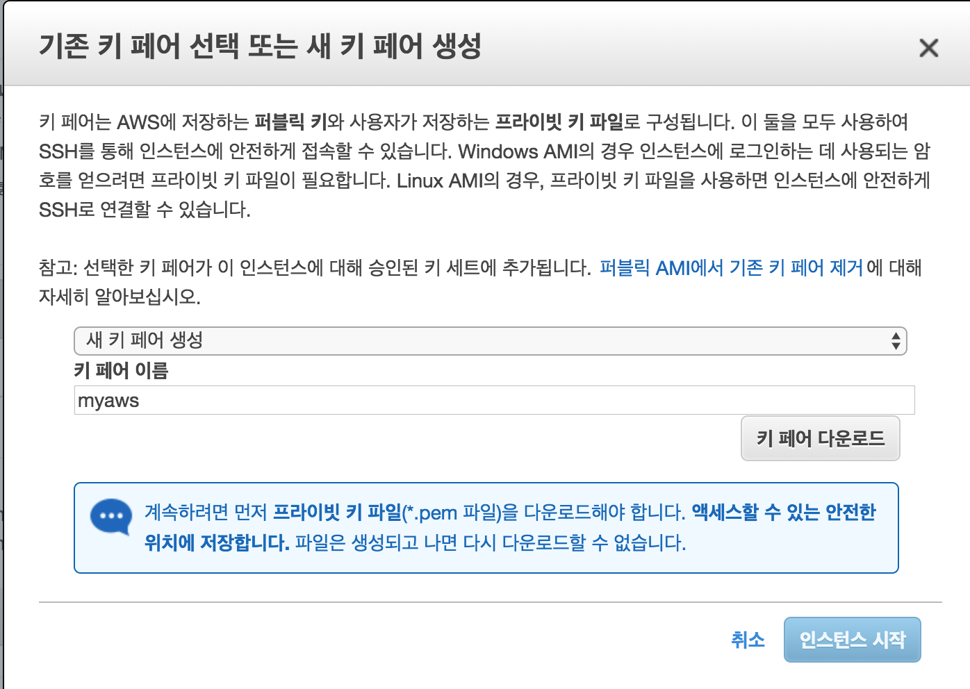 시작을 누르면 아래와 같이 키페어를 생성할지 묻는 화면이 나옵니다. 해당 서버에 접속하려면 이 키페어 파일이 필요합니다.