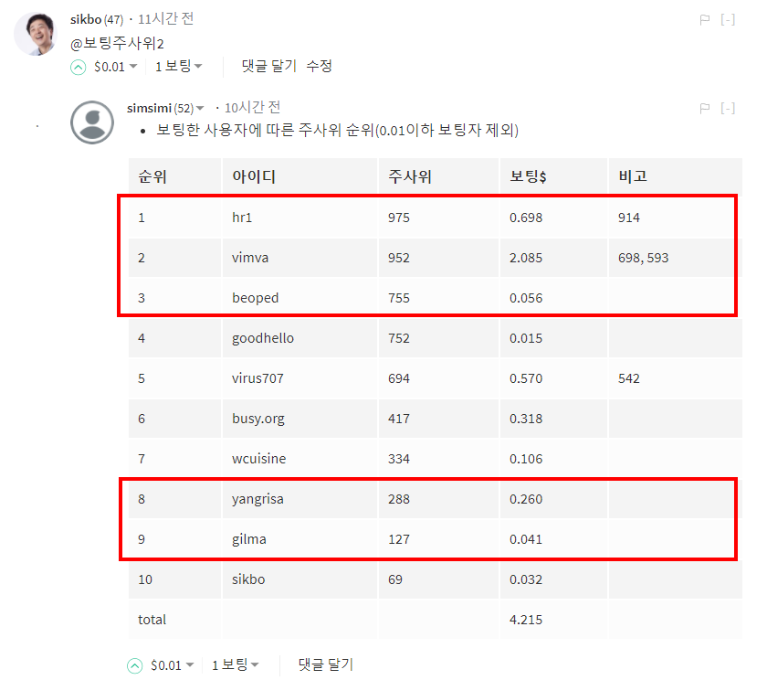 19명이 이벤트에 참여했지만 @보팅주사위2의 규칙대로 0.01이하의 보팅자는 제외가 되어 총 10명의 순위가 발생되었습니다. 이 중 5명에게 선물이 돌아가니 50%의 당첨 확률이 만들어졌네요!
