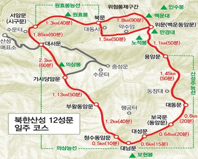 12성문 일주를 2016년 10월과 11월에 2번을 하였습니다. 일주 소요 시간은 8시간 30분 정도이며, 식사와 휴식 시간을 줄이면 8시간 이내에도 가능합니다. 12성문 중 어느 지점이나 시작점으로 가능하며, 위문에서 출발하여 반시계 방향과 서암문에서 출발하여 시계방향으로 돌아보았습니다.