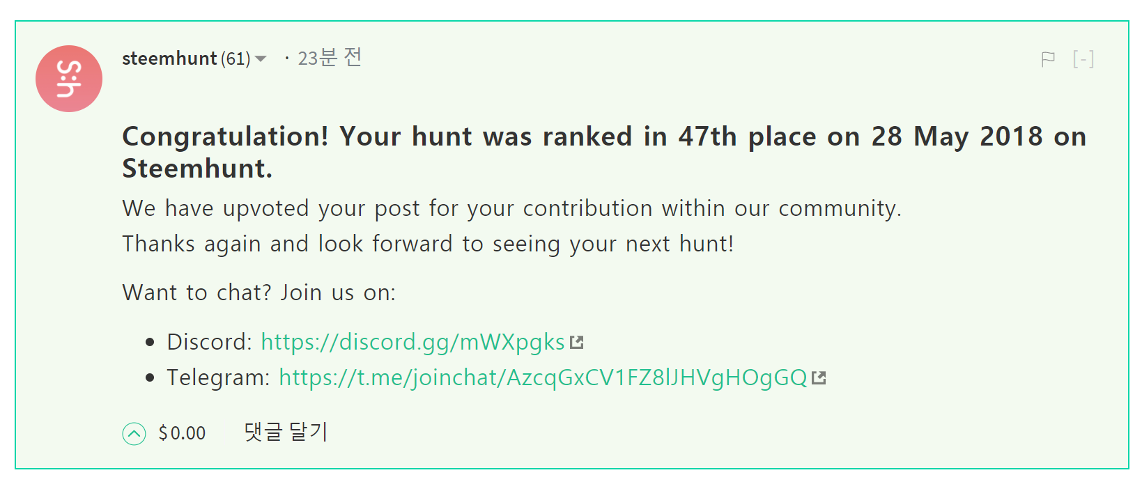 흥미롭게 생각하고 영어 공부도 할 겸 (사실, 파파고를 이용했습니다..에헴. 공부에 도움을 주신 분은 @rothbardianism님이셨죠.)포스팅 해보았습니다. 파파고를 이용했지만, 다시 읽으면서 공부하는 재미도 있더군요. 그런데, 이게 하루 단위로 보팅액이 높은 포스팅을 선정해서 @steemhunt계정으로 보팅을 해주는 것 같았습니다.