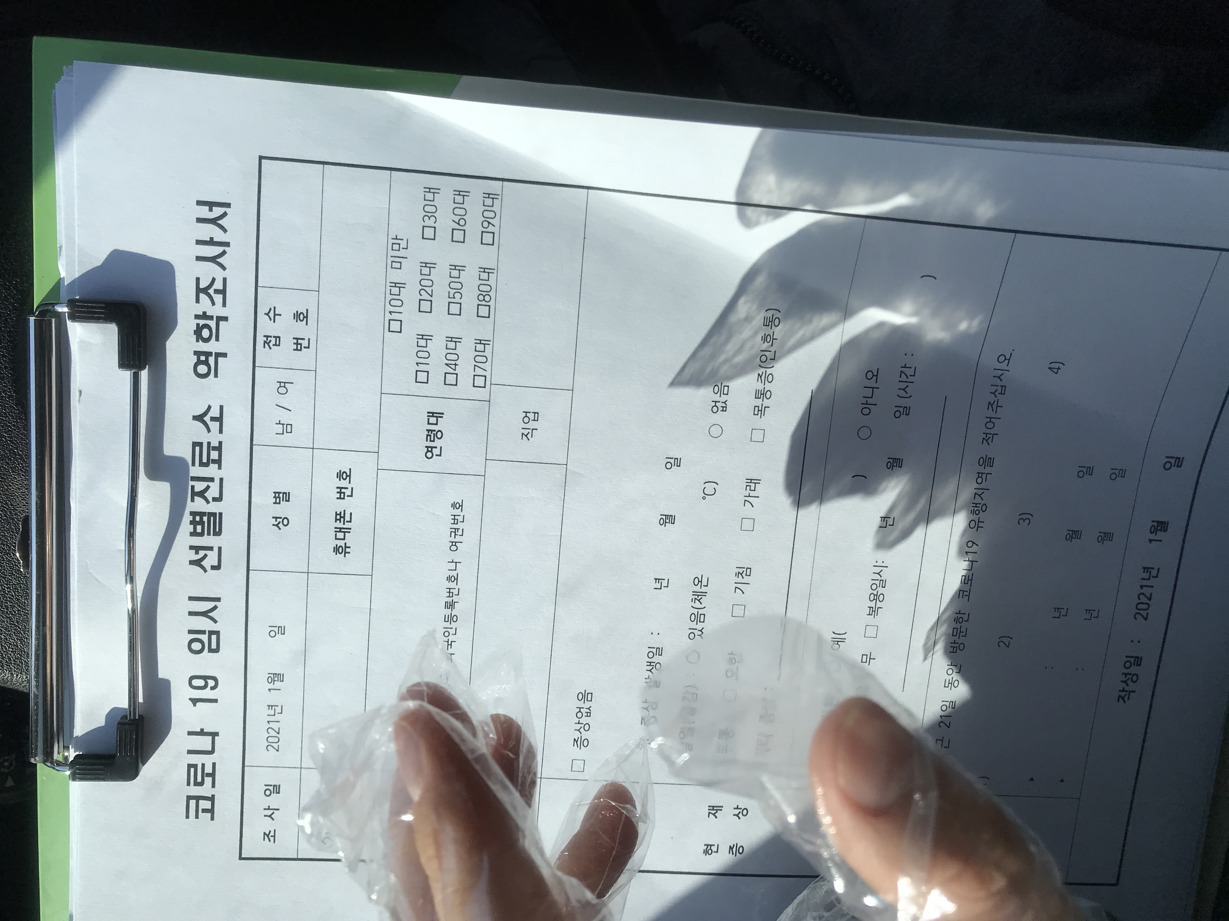 검사소에 차로 30분 정도 기다리니 일회용 비닐장갑과 문진표를 주었다.