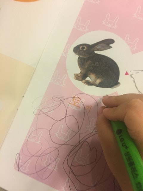 딸에게 "토끼에다가 동그라미 해봐~"라고 하였다.