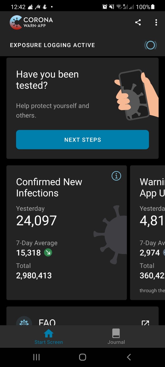 독일도 코로나 관련 앱을 설치해서 정보를 제공받는데, 7일 평균 15000명 감염, 어제 기준 24000명 가량이 감염되었다고 알려준다.