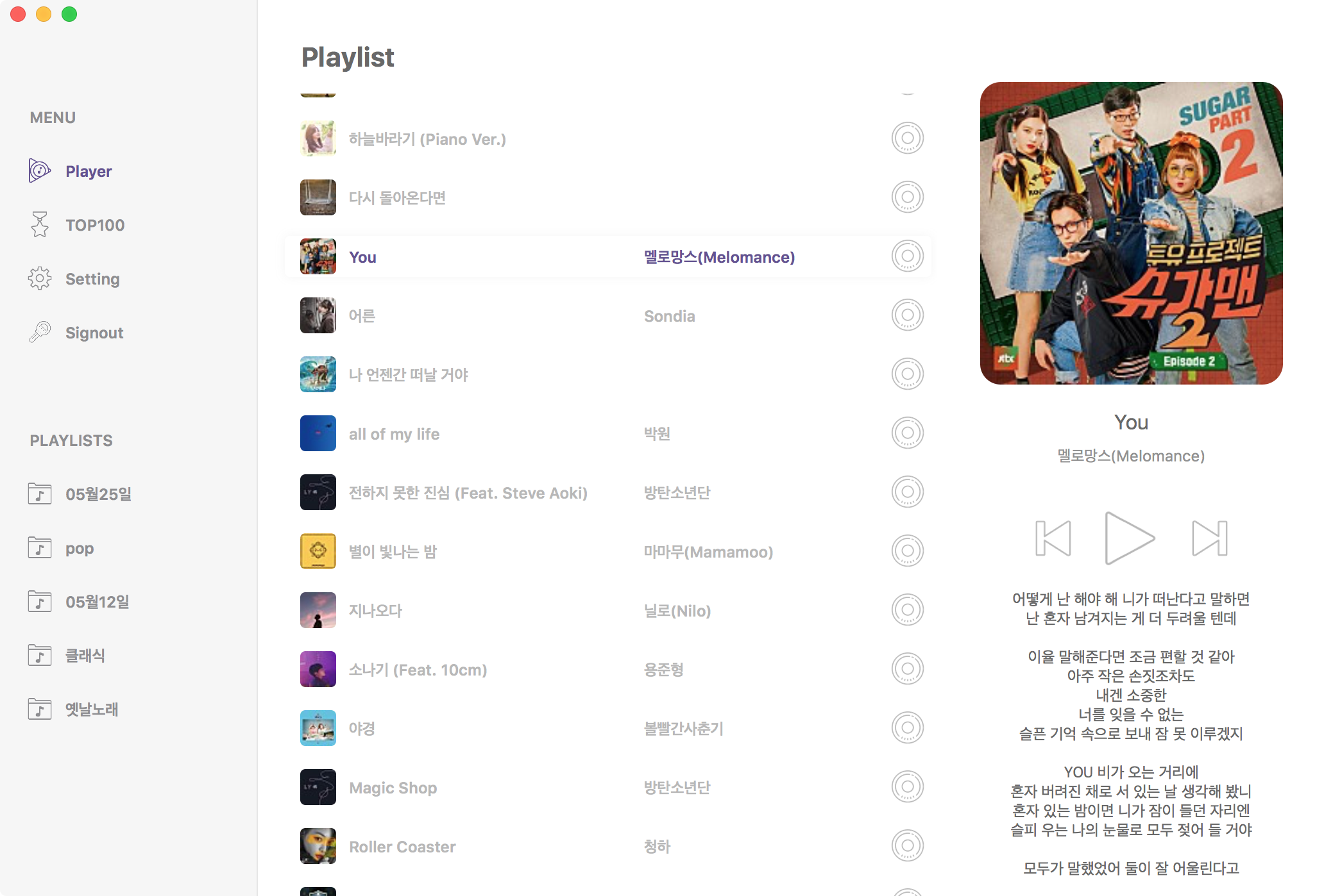 플레이어 화면에서는 플레이 리스트와 재생 기능, 현재 플레이하고 있는 곡의 커버와 가사를 제공합니다.