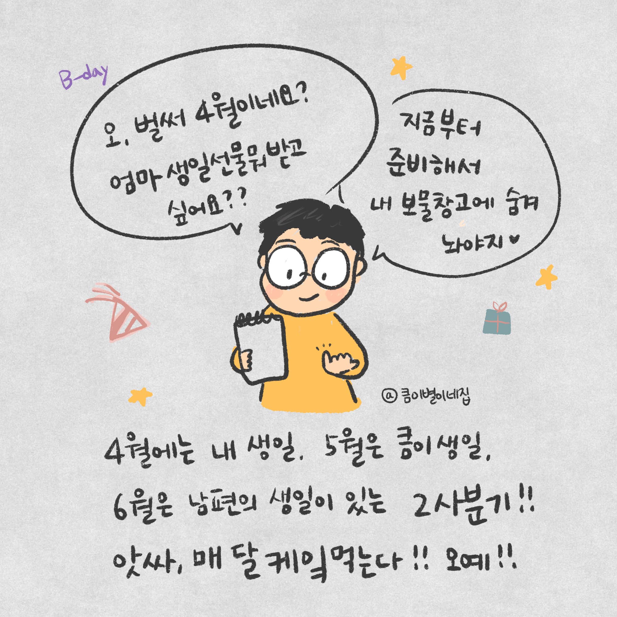 [큼이네집::육아웹툰]solnyou (57)in #kr • 5 years ago [큼이별이네집] 와, 주말 사이에 들썩들썩한 스팀소식에 오랜만에 들어와보았습니다. 2년만의 포스팅이네요! 다들 잘 지내셨지요? 2사분기는 매 달 파티가 예정되어 있어요. 껄껄껄 아직 제 생일까지 열흘 넘게 남았는데 큼이는 벌써 선물 생각을 하네요. 껄껄껄 4월의 첫 주말, 제주는 봄비가 대지를 촉촉하게 적시고 있습니다. 하루하루 웃음이 넘치는 4월 보내세요! #큼이네집