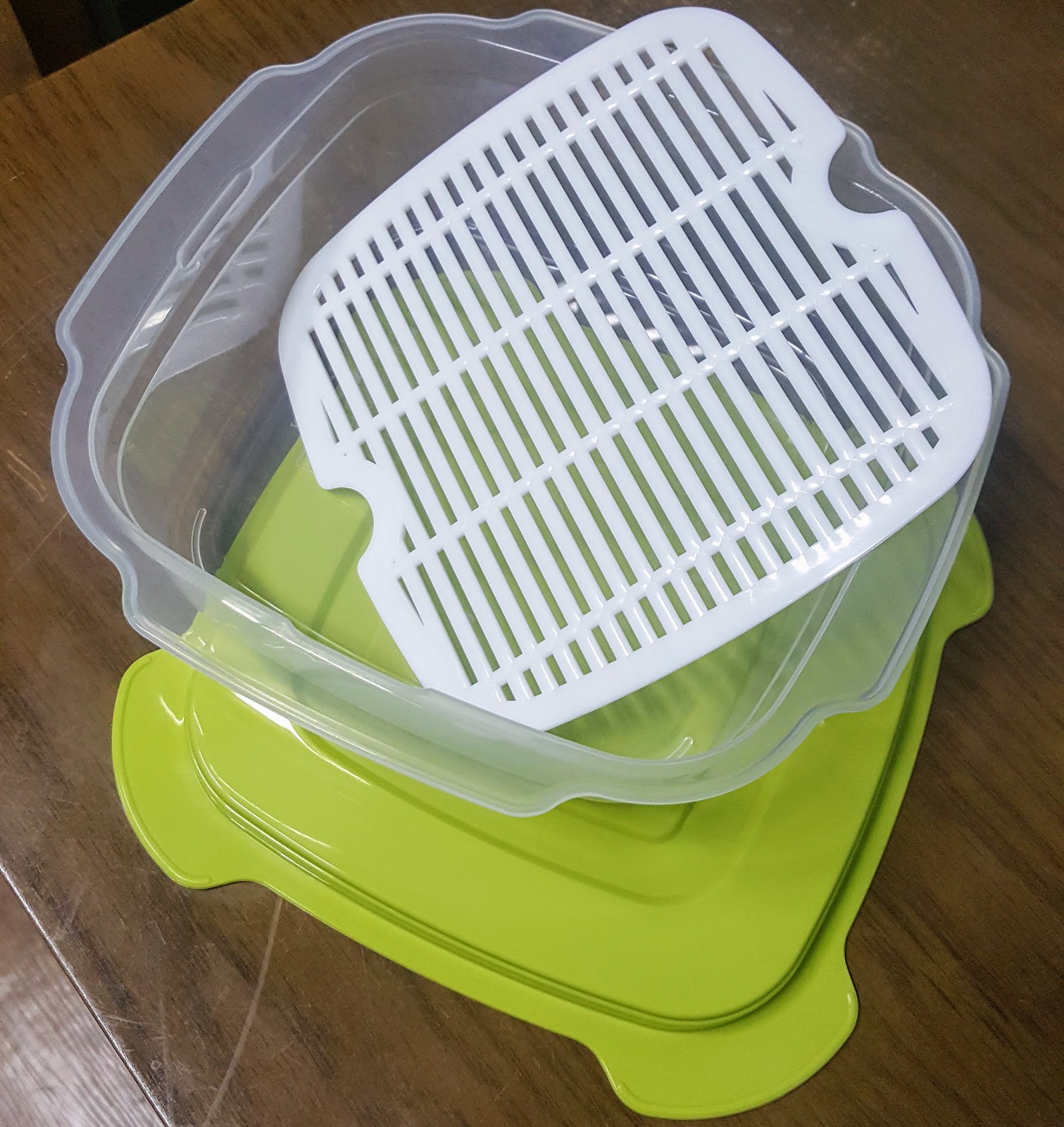 구성은 간단하다. 뚜껑이 있는 작은 플라스틱 용기에 물기가 빠질수 있도록 하기 위한 채반이 있는 구조다.