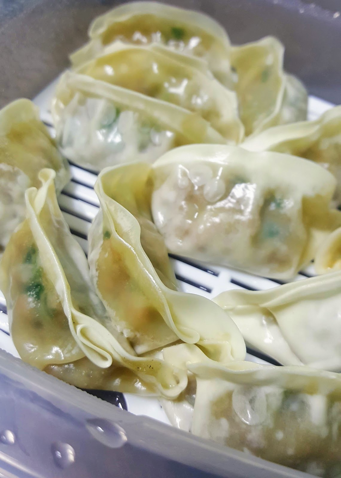 채반 밑에 물을 조금 부어 보았으나 채반밑 공간이 종이컵 1/5 수준의 물만 부어도 만두에 물이 닿는 수준이라 물을 부어 놓는것이 거의 의미가 없다. 아무리 봐도 물을 부어서 쪄먹는 용도는 아니다. 그냥 물기가 만두 직접 닿아 물러지는 것을 막는 것.