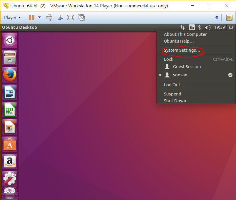 가상머신을 실행시키고 로그인해서 들어 갑니다.