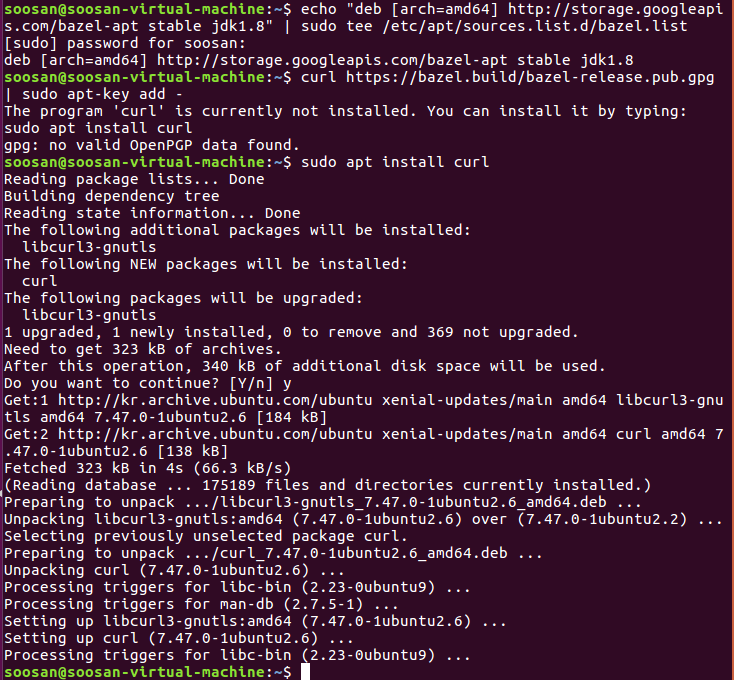 $ curl https://bazel.build/bazel-release.pub.gpg | sudo apt-key add -
