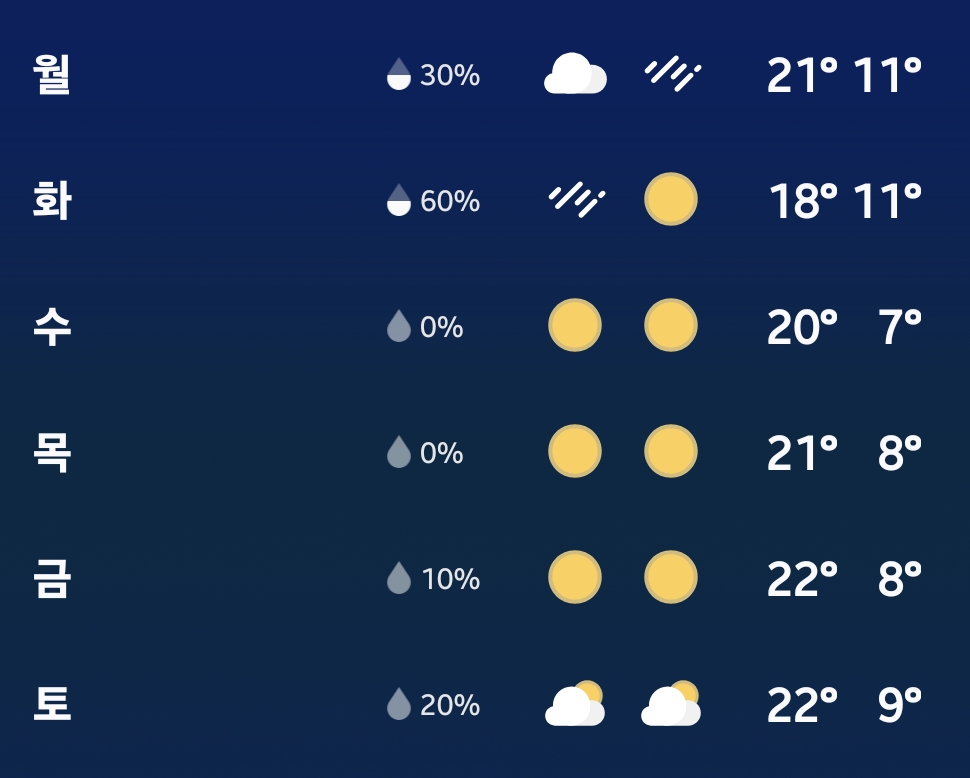 이번주는 월요일 밤부터 수도권 등에 비가 내리겠고, 내륙을 중심으로는 낮과 밤의 기온차가 크겠다고 합니다. 금여일은 5월의 첫날이 시작 되네요. 4월의 마지막 한주 마무리 잘 하시길 바랍니다.