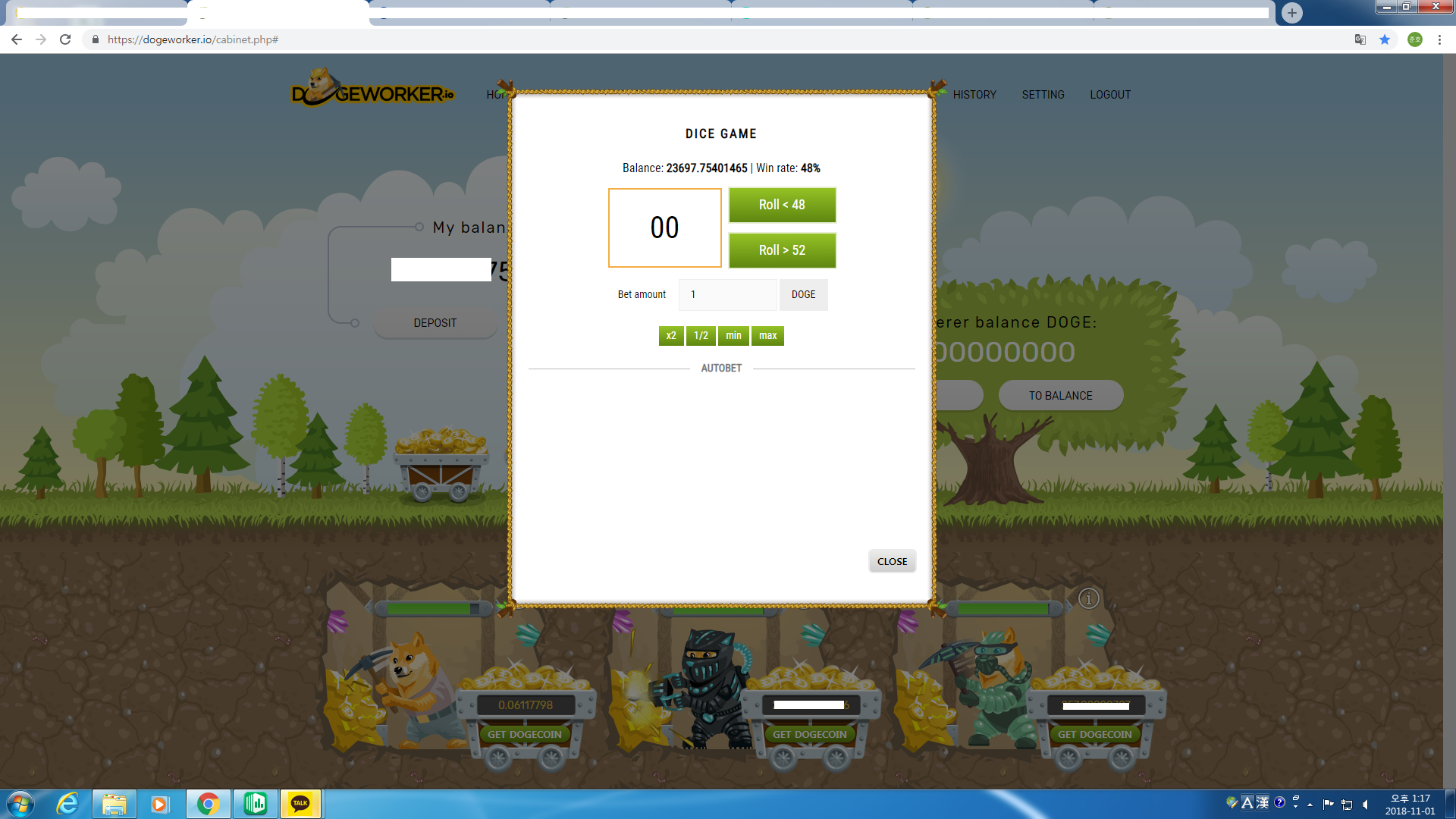 여기에서만 채굴이 되었습니다. 가입하고 나서 주사위를 돌리면 1부터 10000까지의 숫자가 나오구요 지정된 숫자 구간마다 도지 코인의 보상 갯수가 설정되어 있어서 나온 숫자에 따라 보상을 받는 시스템이었습니다.