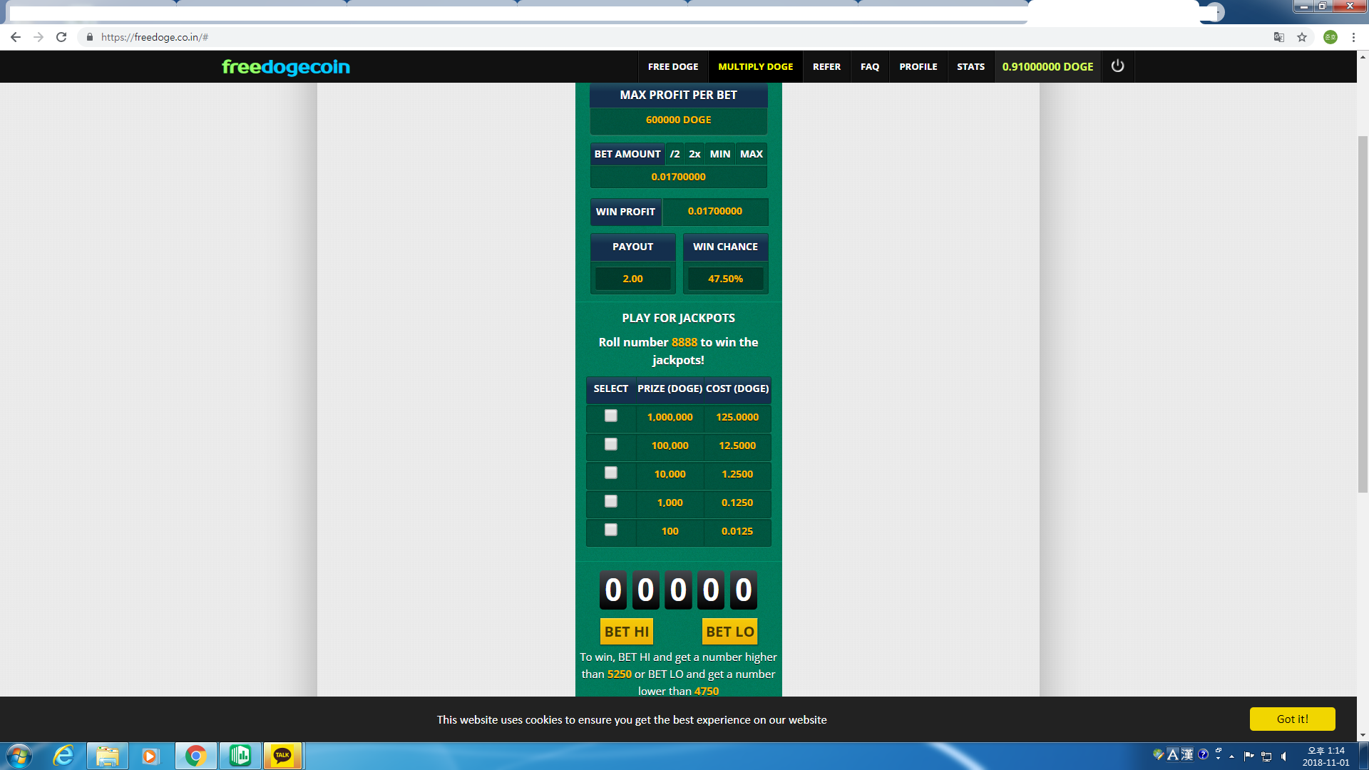 그리고 이렇게 얻은 도지 코인으로 사이트에 같이 만들어져 있는 하이 로우 겜을 즐기는 데 사용하게 되어 있었지요.