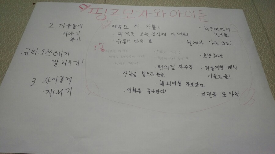 처음 도착 하고 다들 앞에 마주보고 있는 사람이랑 친해질 겸, 그룹 이름도 정하고 그룹 규칙도 정해라 하더라구요.