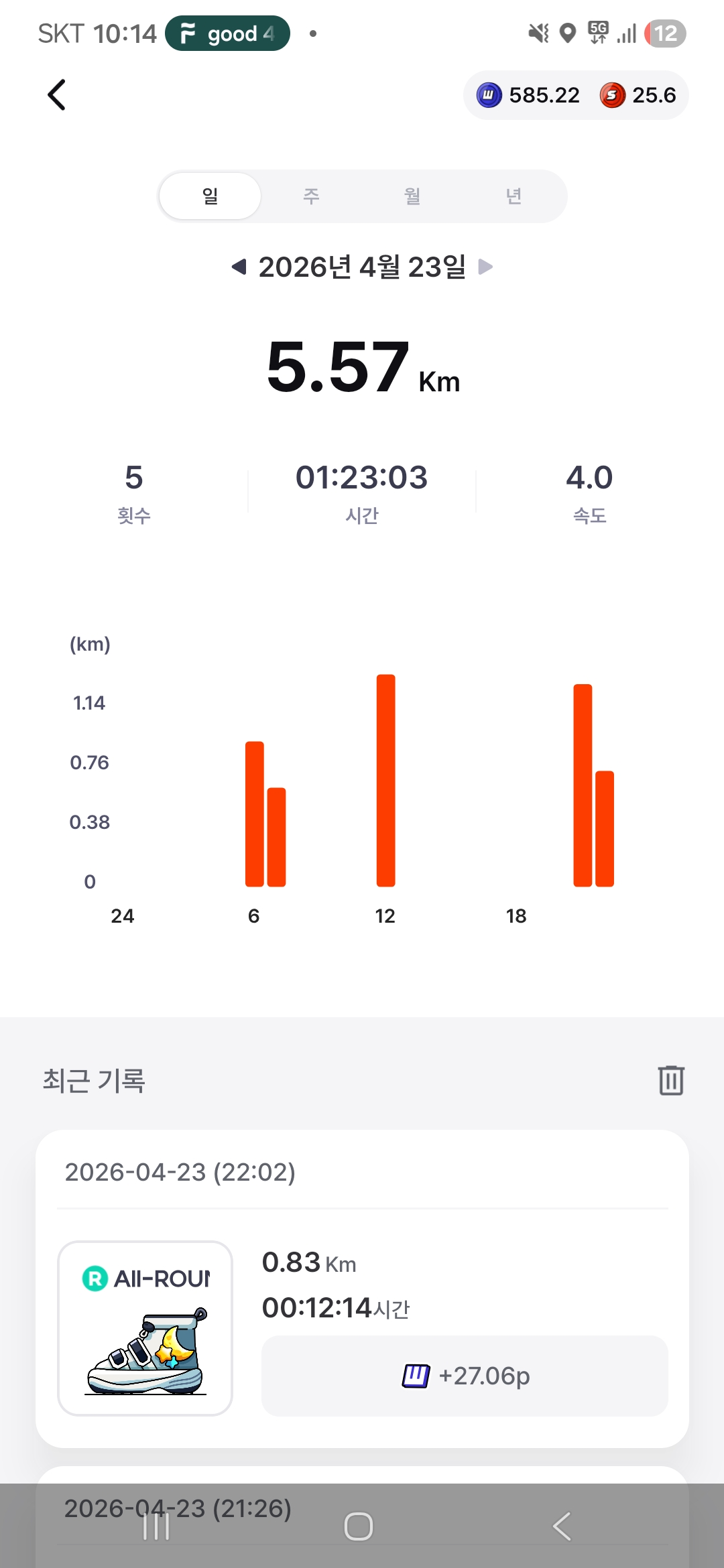 [M2E#694] 2026-04-23 오늘의 운동 완료(5.57/5) - Today's workouttalkit (71)in #kr • 2 days ago 안녕하세요 가야태자 @talkit 입니다. 오늘도 운동 완료 했습니다. 300미터만 더 걷자 하고 나갔다. ^^ 800미터를 걸어 버렸습니다. ㅎㅎㅎ 그래서 5km 보다 조금 더 걸었습니다. 내일도 성공할 수 있기를. ... Posted using SteemX #kr-m2e #talkit #exercise #stepn #stepn-kr #workout