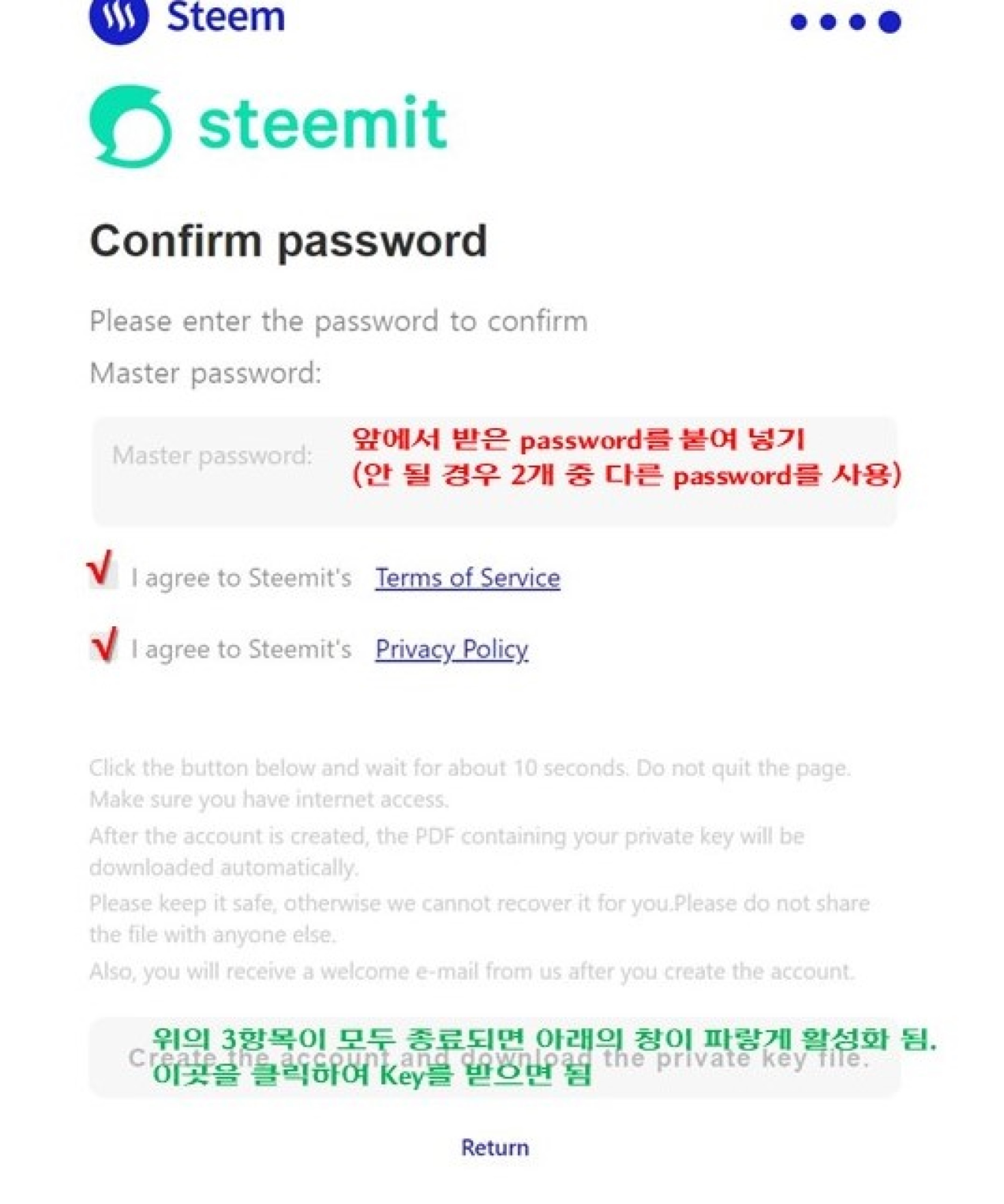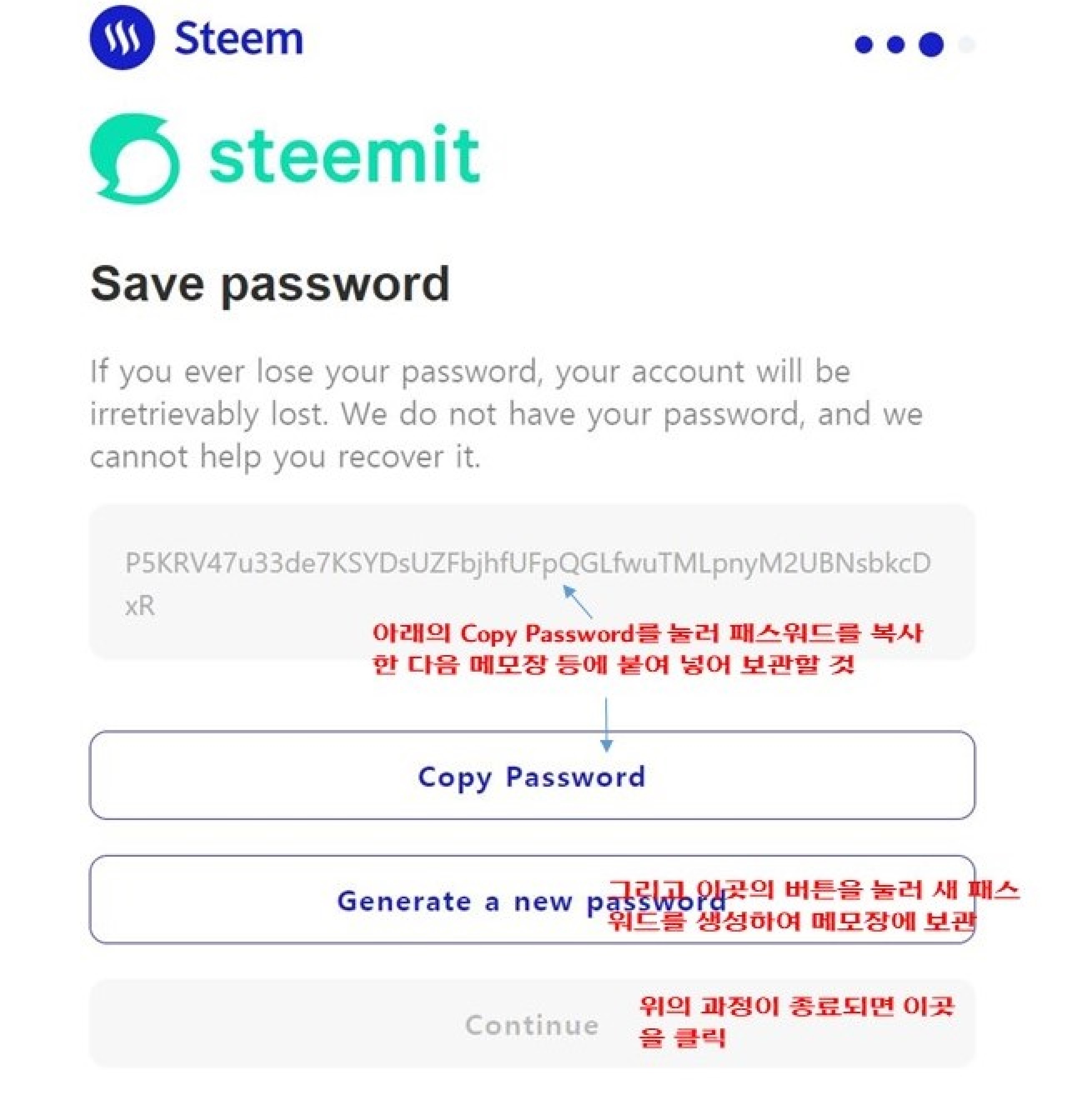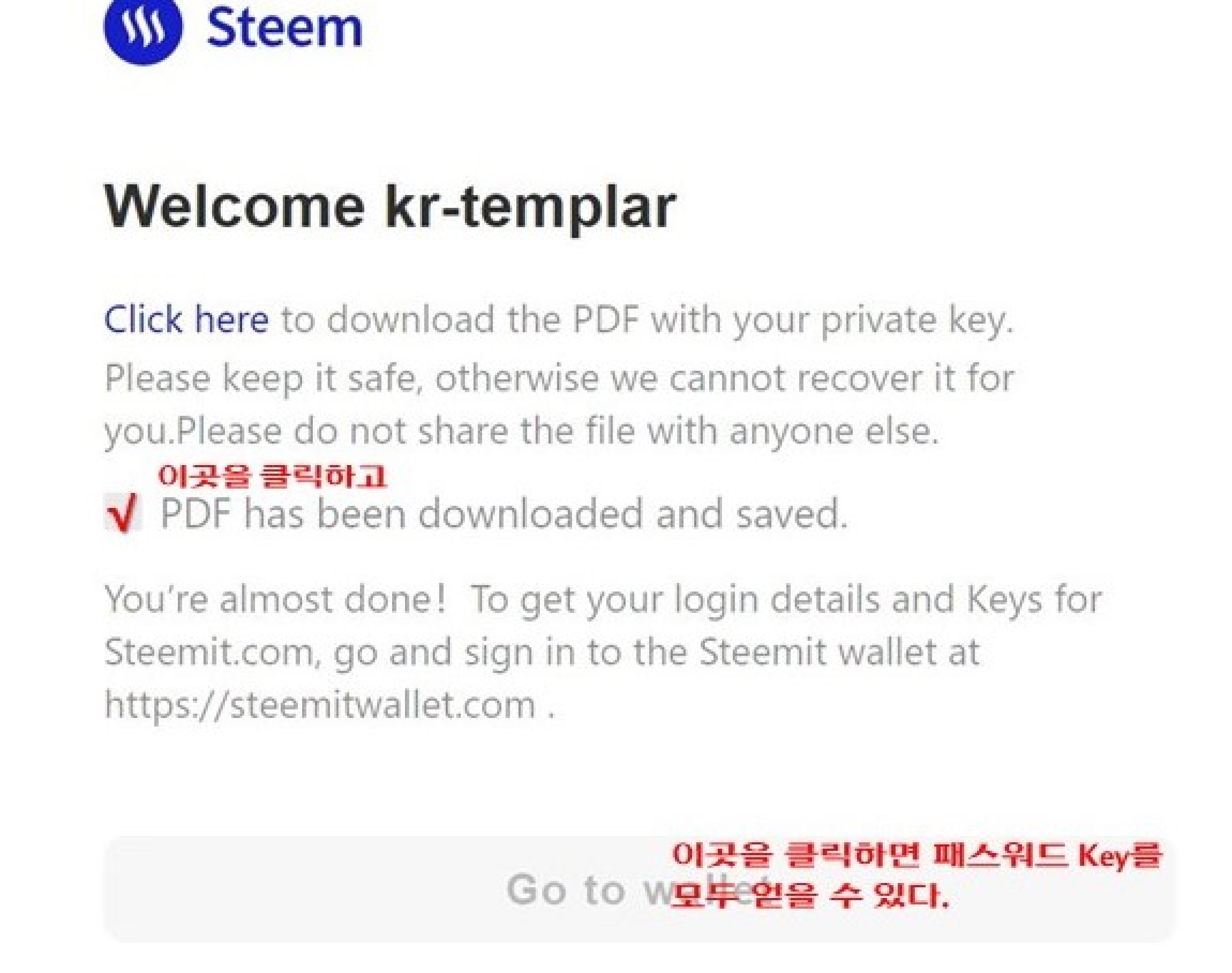 위의 A4용지의 PDF파일을 잘 보관해 놓으면 된다. 다시 강조하지만 이 Key를 분산하여 보관해 놓는 것이 좋다. 없어지면 다시는 스팀잇을 살리지 못한다.