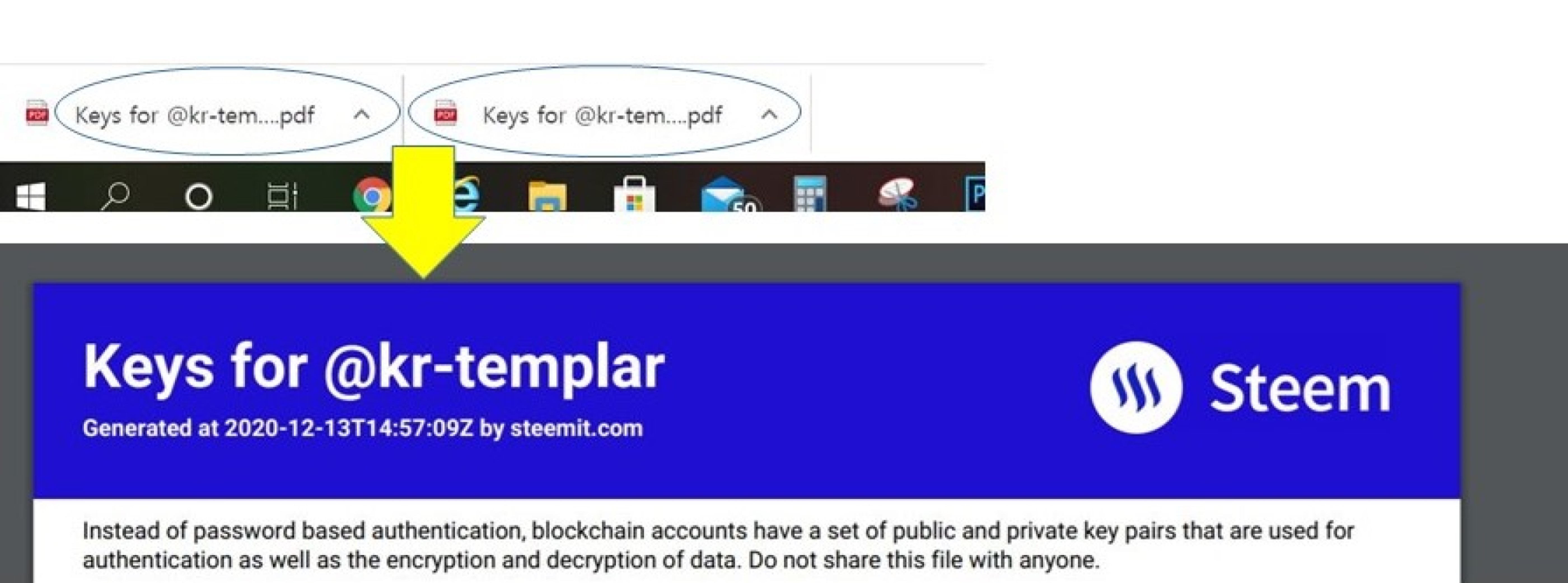 과거와 달리 최근 TRON지갑이 합쳐진 이후부터는 스팀잇의 key와 트론의 key가 한꺼번에 기록되어 2장의 PDF파일로 화면 왼쪽 아래에 나타난다. 그곳을 클릭하여 내용을 본 뒤 화면 오른쪽 상단의 프린트 옆의 기호를 눌러 보관하면 된다. 이 key는 절대 분실해서는 안 된다.